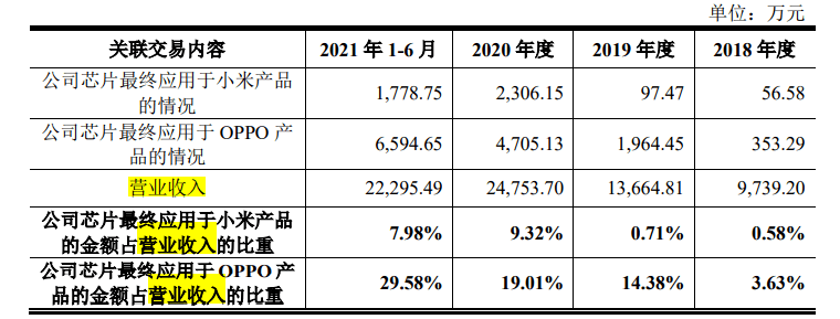 实控人代持惹是非 截至招股书签署日,鞠建宏直接持有25.56%的股权,为公司控股股东;此外,鞠建宏分别通过上海芯溪、南通圣乐、上海芯乐和南通圣喜间接控制公司股权,合计控制公司29.79%的股权,且担任公司董事长、总经理职位;公司董事周健华与鞠建宏系夫妻关系,周健华与鞠建宏为公司共同实际控制人。 帝奥微历史上曾存在股权代持的情形,主要是实控人之一的鞠建宏帮他人代持。 据披露,2016年10月,自然人陈炜、刘勇与鞠建宏签署了《股权代持协议书》,约定作为支付陈炜、刘勇两人融资的管理费用180万元,鞠建宏为两人分别代持了帝奥微有限(公司前身)注册资本40.82万元;同月,自然人高峰也委托鞠建宏代持公司100万元注册资本。上述代持均于2017年解除。 股权代持也曾给这位实控人带来麻烦。 公开信息显示,2011年,帝奥微有限作出股东会决议,即“股东会一致同意鞠建宏个人增资入股帝奥微电子有限公司105万元,这部分增资系鞠建宏代持李鑫(200万股,每股1元)、李红娟(300万股,每股1元)所持有”。其中,李鑫系公司历史股东帝奥投资法定代表人王进飞之外甥,李红娟系公司股东安泰房地产法定代表人施健之配偶。 后因各方对上述股权代持存在争议,鞠建宏于2021年就与公司决议纠纷案向江苏省南通市崇川区人民法院提起诉讼,后续追加第三人李红娟、李鑫、安泰房地产及帝奥投资参与诉讼。 鞠建宏认为,因该决议中未明确代持股权的来源和方式,后续对于前述事项并未签订代持协议,且与被代持方无任何资金往来,因此彼时股东会决议代持部分的决议不成立,涉争的500万股仍归鞠建宏所有;而李鑫、李红娟则认为,前述股东会决议系各方对于代持事实的确认,无需签署协议或支付价款。 2021年11月,经法院调解后各方达成《调解协议》:涉及李鑫的200万股公司股份归鞠建宏所有,鞠建宏同意支付其1800万元;而至于涉及李红娟的300万股股份则归安泰房地产所有,鞠建宏已将所持1.59%股权无偿转让给安泰房地产,上述代持关系才最终得以解除。参考最近一次公司股权转让获得的估值来看(2020年9月),这部分300万股股份对应的价值或至少有2213万元。也就是说,上述代持对应的股份价值在4000万元以上。 此外,公司的两位实控人还存在尚未偿还的大额借款。 据披露,鞠建宏和周健华至今尚未偿还的借款余额为3366万元,出借人为包括公司的直接股东(郑慧、顾宁钟、高峰)、间接股东(罗邦飞)以及实控人亲属(鞠建云、周玉辉)。其中郑慧(还曾担任过公司监事)与鞠建宏资金往来频繁,鞠建宏共计借款2366万元,用途包括缴纳税费、支付员工持股平台出资款、履行《调解协议》等。 新晋股东“送”上业绩 说完了公司的股权代持情况,让我们来看看它的业绩表现。 据介绍,帝奥微主要从事高性能模拟芯片的研发、设计和销售,按照产品功能的不同,公司产品主要分为信号链模拟芯片和电源管理模拟芯片两大系列,主要应用于消费电子、智能LED照明、通讯设备、工控和安防以及医疗器械等领域。 IPO日报注意到,小米和OPPO还通过增资和股权转让等方式入股了公司。 公开信息显示,2019年12月,小米长江产业以5456.88万元的价格受让了公司彼时5.51%的股权(对应出资额900万元),并于2020年4月再度以货币资金向公司投资3499.02万元,其中519.38万元计入注册资本、剩余2979.64万元计入资本公积;2020年9月,OPPO 广东也通过增资的方式认购了公司非公开发行的819万股,作价6041.49万元。 本次发行前,小米长江产业持有公司7.5%股份,为公司的大股东,OPPO 广东持股比例为4.33%。 有意思的是,就在入股帝奥微后或即将入股公司之时,作为终端客户的小米和OPPO开始大量采购公司的产品。这到底是一种巧合,还是早有计划? 公司的新增前五大客户中,2019年新增经销商客户联烨集团和泰科源集团,对应主要终端客户有OPPO、华勤以及创维等;2020年新增经销商客户WPI集团和文晔集团,这两家公司的主要终端客户为小米和大华。 申报稿显示,2018年至2020年及2021年上半年(下称“报告期”),帝奥微的营业收入由2018年的9739.2万元上升至2019年的1.37亿元,并于2020年增加至2.48亿元,2021年上半年营业收入为2.23亿元。 从占比来看这一影响更为明显。2019年,公司的芯片产品最终应用于OPPO产品产生的收入增加至1964.45万元,并增长至2021年上半年的6594.65万元,在帝奥微营业收入中占比也从报告期期初的3.63%快速上升至期末的29.58%;报告期内公司的芯片产品最终应用于小米产品产生的收入在公司营业收入占比也由0.58%上升至7.98%,2020年度达到9.32%。