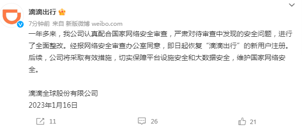 @滴滴出行官方微博发布消息称,一年多来,其认真配合国家网络安全审查,严肃对待审查中发现的安全问题,进行了全面整改。经报网络安全审查办公室同意,即日起恢复“滴滴出行”的新用户注册。