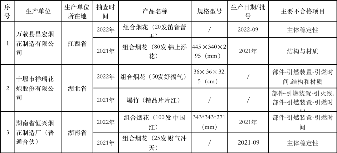 本次抽查了组合烟花、爆竹、喷花、旋转、吐珠、玩具、升空等7类烟花爆竹产品,覆盖了个人燃放类烟花爆竹产品全部类别。其中组合烟花类产品抽查了95批次,抽查不合格率为11.6%;爆竹类产品抽查了88批次,抽查不合格率为14.8%。该产品近3年国家监督抽查不合格率分别为14.0%、12.3%、12.8%。