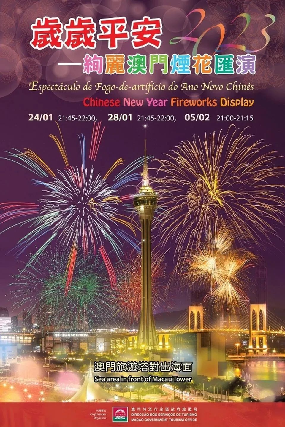 2023年农历新年花车汇演彩排情况 “岁岁平安—绚丽澳门烟花汇演”的首场烟花表演,也于明晚9时45分在旅游塔对出海面上演,15分钟的烟花表演将当晚喜庆的气氛推向高潮。