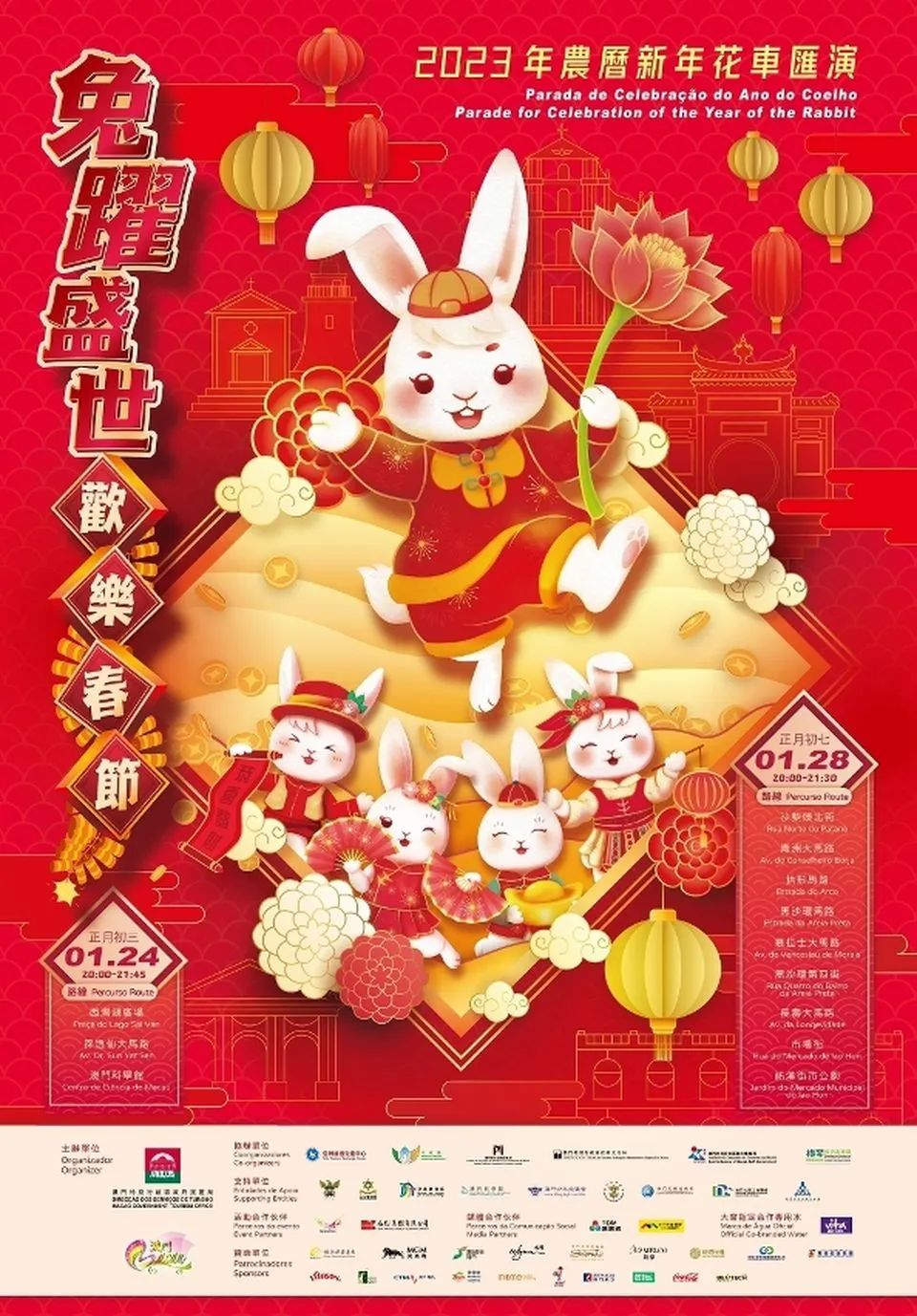 阵容鼎盛的花车队将于1月25至27日在澳门科学馆海堤展出;1月29日至2月12日在塔石广场展出,供居民及旅客近距离观赏,拍照留念。“兔跃盛世·欢乐春节2023年农历新年花车汇演”详情,请浏览https://www.macaotourism.gov.mo/zh-hant/article/cny/parade-2023或关注“澳门特区旅游局”微信了解更多内容;2023年澳门贺岁活动资讯,请浏览https://www.macaotourism.gov.mo/zh-hant/article/cny/celebrations-2023。