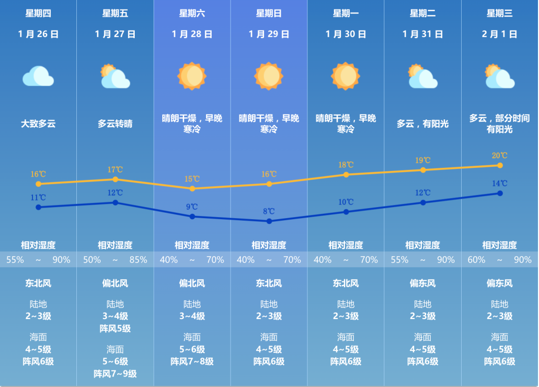 这两天珠海又冷又大风 早上爬出被窝都觉得 自己是一名“勇士” 在家里待着也不敢脱下羽绒 “广东天气”微博9时10分发布信息称 受中等偏强冷空气影响 今天早晨广东半数地区 出现5℃以下低温, 创今年以来新低。 资料图。珠海传媒集团 曾遥/摄 也许有珠海街坊会问, 什么时候回温? 新一波冷空气将要来! 气温将再次下降! 根据珠海市气象台信息,预计明天我市大致多云,气温小幅回升; 27日起受新一股冷空气影响,转晴冷天气; 28-29日我市气温再次下降,天气晴朗干燥,早晚寒冷。 【珠海7天天气预报】 目前, 珠海森林火险橙色预警、 寒冷黄色预警正在生效, 请注意防御! 天气寒冷 各位珠海街坊 出门探亲、游玩时 不要为了风度而忽略温度哦 记得添衣保暖 近期天气干燥 家居用火请注意安全 文章来源于珠海特区报,如有侵权请联系删除。本文仅代表作者观点,不代表大湾网的观点立场。 |