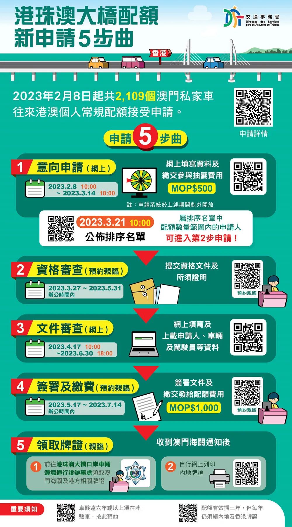 特区政府即日(1月26日)起推出2,109个澳门私家车往来港澳个人常规配额予公众申请。经评估需求情况,是次将以个人配额供申请,有意申请并符合资格人士可于2023年2月8日上午10时至3月14日下午6时前到交通事务局网页https://epay.dsat.gov.mo提交意向申请表及缴交参与抽签费用澳门元500元,上述配额有效期为三年,每个配额费用为澳门元1,000元,相关费用一经缴付不予退还。特区公报今(1月26日)刊登《2023年度澳门私家车往来港澳个人常规配额申请》公告,接受符合资格的申请人申请澳门私家车往来港澳个人常规配额,申请人必须为在香港从事受薪工作、或开设公司(须于2023年1月1日前成立)、或持有房屋/商铺/土地等自置物业(车位除外)的澳门居民,且必须为指定驾驶员,但年龄达70岁或以上的申请人可无须作为指定驾驶员。有关配额申请分两阶段进行,分别是:意向申请及配额分发申请。合资格人士于2023年3月14日前完成网上提交意向申请及缴费后,排序名单将于2023年3月21公布,排名在首2,109位的申请人其后进入配额分发申请阶段,须按指定时间透过网上及亲临马交石服务专区递交文件及缴费。倘于2023年内新增相关常规配额,将按是次抽签排序名单的顺序接续分发。持有配额的澳门注册私人用途轻型载客汽车可在三年有效期内多次经港珠澳大桥往来港澳两地。相关申请的行政手续及注意事项可于网页https://www.gov.mo/zh-hant/services/ps-2021/ps-2021a/查阅。