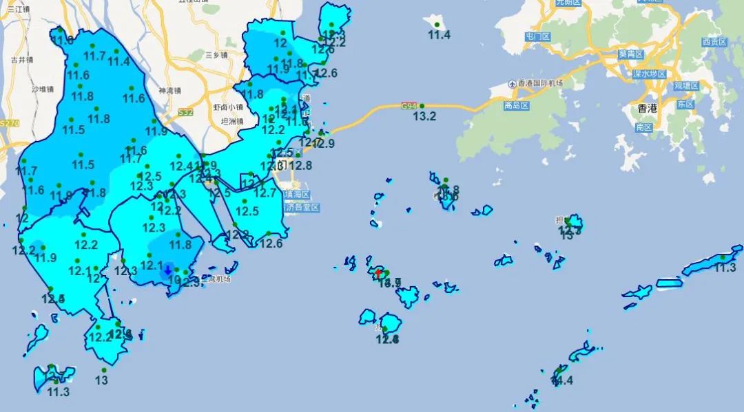 昨天早上珠海最低气温普遍只有11-12℃