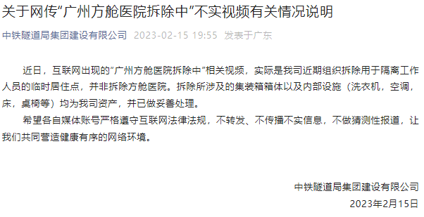 昨晚(2月15日),中铁隧道局集团建设有限公司发布情况说明称,近日,互联网出现的“广州方舱医院拆除中”相关视频,