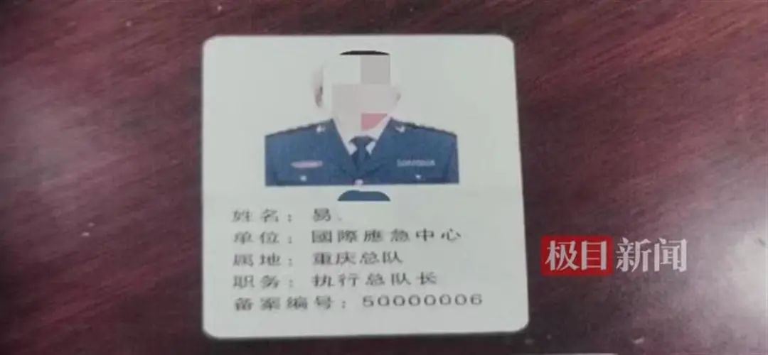 在酒店里,张女士看见易某等人穿着深蓝色制服,还配备了对讲机。易某拿出自己的假证件,证件单位为“国际应急中心”,职务为“重庆总队执行总队长”。易某告诉张女士,自己目前在此单位挂职。