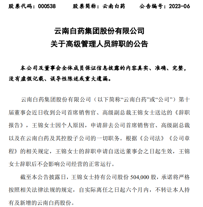 继董事长王明辉辞任后,3月15日,云南白药又一高管递交《辞职报告》。