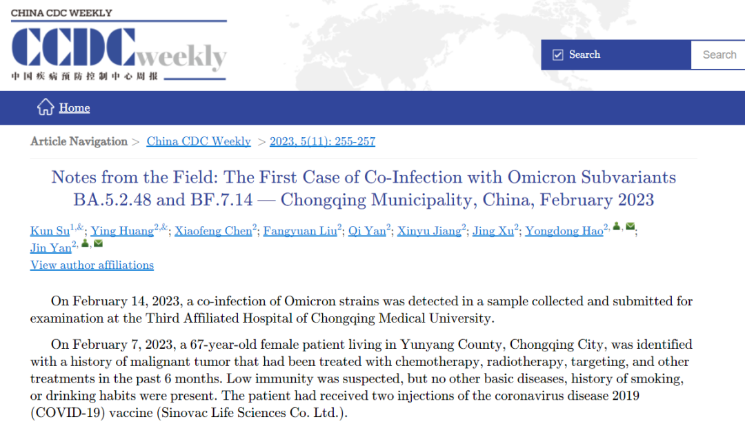 : 3月17日,中国疾控中心网站发布最新《中国疾病预防控制中心周报(China CDC weekly)》。周报称,2月14日,在重庆医科大学附属第三医院采集并送检的样本中检测到奥密克戎毒株的共同感染。2022年12月23日,这位患者报 ...