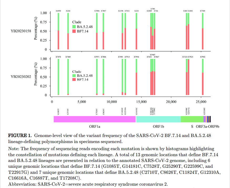 突变位点分析显示,两个样本都含有奥密克戎亚变体BA.5.2.48和BF.7.14的特异性定义位点,患者同时感染了奥密克戎亚变体BA.5.2.48和BF.7.14。
