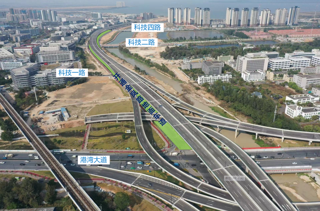 金琴快线北延段是珠海衔接深中通道的路网,分两期建设,其中一期工程由高新互通立交向北延伸,主线为高架,辅道设置于地面。沿线途经高新区科技创新海岸片区,产业聚集,上班族通勤需求大。北延段项目在未来全部完成建设后,在科技四路附近设置有进出主线的匝道。