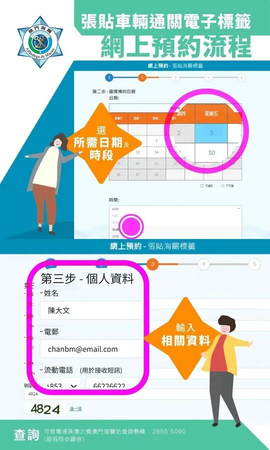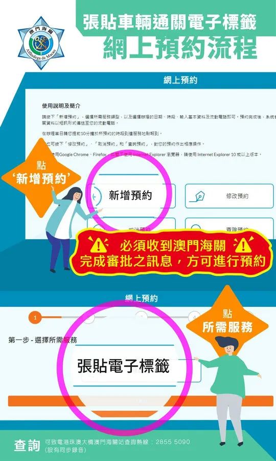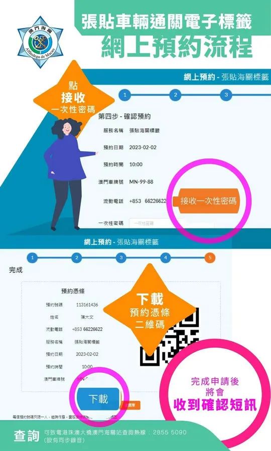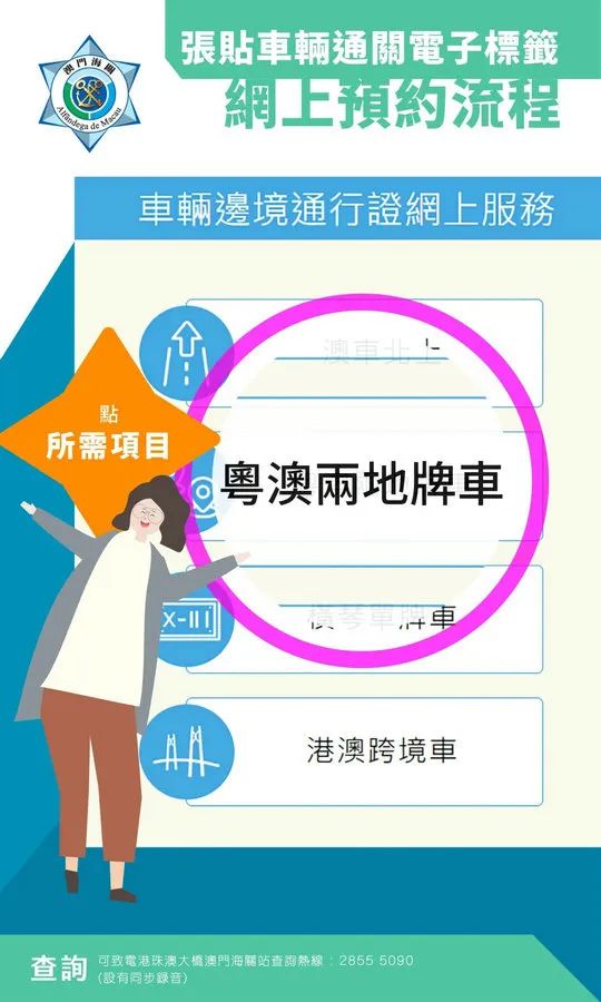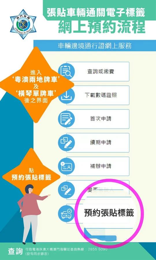 海关将于今(20)日推出“车辆通关电子标签网上预约服务”,已获海关审批但尚未张贴车辆通关电子标签的粤澳或港澳跨境车辆,申请人可透过海关官方网页、微信账号或手机应用程式,登入车辆边境通行证网上服务系统办理预约手续,并按照预约时间前往张贴车辆通关电子标签。 一、申请人在登入车辆边境通行证网上服务系统后,按自身情况选择正确的车辆种类,当中申请人必须注意要收到海关完成审批车辆的讯息,才可预约;五、点击接收一次性密码及输入正确后,即可完成申请;六、申请人将收到确认短讯,并可下载预约凭条二维码;申请人按照预约的日期及时段驾驶车辆至港珠澳大桥澳门海关站,即可办理车辆通关电子标签张贴手续。 系统同时设有更改预约日期及取消预约的服务,申请人可登入车辆边境通行证网上服务系统进行相关操作。如申请人未有按照预约日期和时间为车辆办理张贴标签手续,则必须透过系统重新预约。如有任何疑问,可于办公时间致电28555090查询。