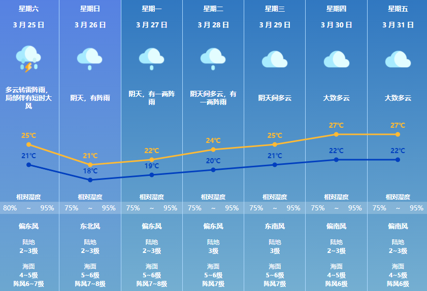 紧急提醒! 中午就要下大雨了 雷雨虽然迟到了 但终究没有缺席 图片来自网络 预计雷雨云系将自北向南影响我市 珠海将转雷雨天气 局部雨势较大并伴有短时大风 市气象台于3月25日10时40分发布 雷雨大风黄色预警信号 这也是今年首次发布上述预警 雷雨云带目前位于江门至中山一带,正在逼近珠海北部,预计中午至下午将横扫珠海,大雨和雷暴一触即发!请注意防雷防雨!没带伞的赶紧拿上,驾驶人士注意交通安全。如遇雷暴,千万不要在树下避雷,并关闭电子设备。 这场雨总算还是来了 在过去的两三天 雷雨云系在珠海北边擦过 周五上午广州城区出现冰雹 说明冷暖气流正在猛烈对峙 但对峙的主战场在更北边的地方 目前珠海各地普遍都在24-25℃ 在降雨的作用之下 预计下午气温将下降2-3℃ 而随着冷空气继续南下 入夜后气温将继续下降 周日气温将维持在18-21℃ 体感凉爽,最好还是披件外套吧 文章来源于珠海天气,如有侵权请联系删除。本文仅代表作者观点,不代表大湾网的观点立场。 |