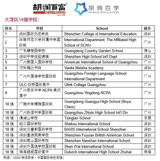 2019年2月,《粤港澳大湾区发展规划纲要》发布,其中明确指出,大力引进国际化人才、建设国际教育示范区、联结粤港澳三地合作办学、建设大湾区教育和人才高地、打造新型“教育特区”! 围绕打造新型“教育特区“,粤港澳大湾区鼓励积极开展合作办学,进一步完善跨区域就业人员随迁子女就学政策,一举成为中国国际化学校行业最炙手可热的办学地区。 2019年大湾区共计新增学校19所,占全国新增学校40所的47.5%,成为全国增长最快的地区。截止至2019年底,大湾区国际化学校数量共计158所,市场规模76.77亿,在校生人数8.08万,平均学费9.5万。其中,民办国际化学校市场份额为67%,广深两地国际化学校整体市场份额占比超过72%。(数据来源:新学说) 令人期待的大湾区国际化教育 1、大湾区的国际学校水平逐步提高 2020年5月,胡润百学发布了《2020胡润百学·中国国际学校百强》这是胡润百学连续第三次发布“中国国际学校”排行榜,榜单录入了来自24个中国大陆城市的百强国际学校。在榜单中,上海和北京仍是国内优秀国际学校最重要的聚集地,但整体来说,大湾区的国际学校水平逐步提高,进入总榜百强、前20名的学校越来越多。