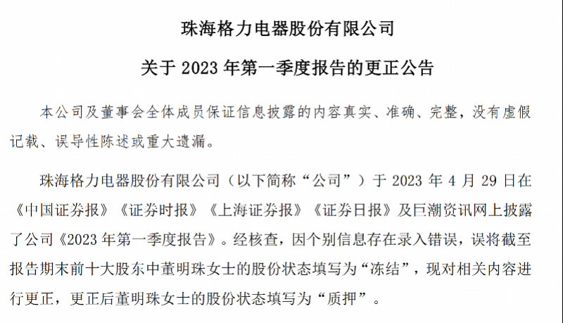 股票被“冻结”一事引发热议。对此,5月5日晚间,格力电器发布公告《关于2023年第一季度报告的更正公告》,称公司此前发布的一季报中,因个别信息存在录入错误,误将截至报告期末前十大股东中董明珠的股份状态填写为“冻结”,现对相关内容进行更正,更正后董明珠的股份状态填写为“质押”。