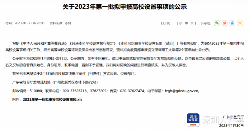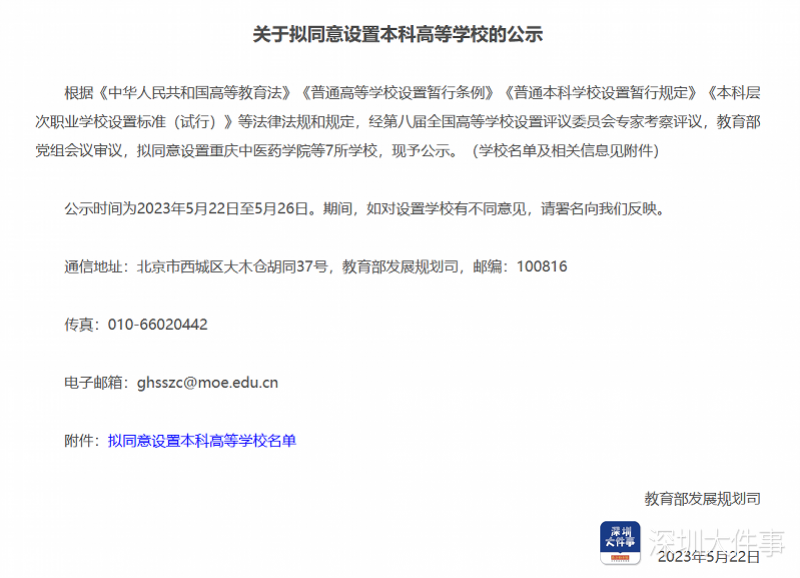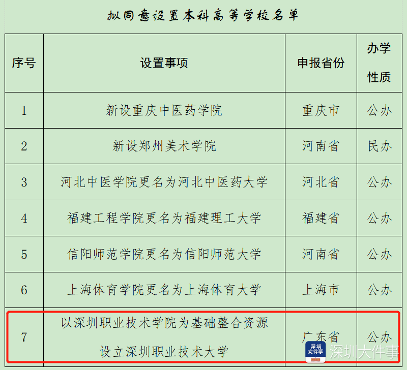 深职院拟升本!昨日(5月22日) 教育部官网发布了 《关于拟同意设置本科高等学校的公示》 其中提到 以深圳职业技术学院为基础整合资源 设立深圳职业技术大学 意味着深职院或将“专升本” 深职院升本再进一步教育部正在公示5月22日,教育部发展规划司《关于拟同意设置本科高等学校的公示》发布,在拟同意设置本科高等学校名单中,广东省申报的公办本科高校,“以深圳职业技术学院为基础整合资源设立深圳职业技术大学”。 公示提到,根据《中华人民共和国高等教育法》《普通高等学校设置暂行条例》《普通本科学校设置暂行规定》《本科层次职业学校设置标准(试行)》等法律法规,经第八届全国高等学校设置评议委员会专家考察评议,教育部党组会议审议,拟同意设置重庆中医药学院等7所学校,现予公示。公示时间为2023年5月22日至5月26日。 实际上在今年1月,广东省教育厅就发布了《关于2023年第一批拟申报高校设置事项的公示》,拟在深圳职业技术学院(以下简称“深职院”)基础上申报设置“深圳职业技术大学”,拟申报类型为职业本科。 深职院去年招生计划 首次突破万人大关 1993年创建的深职院是国内最早独立举办高等职业技术教育的院校之一,现有留仙洞、西丽湖、官龙山、华侨城、凤凰山、深汕特别合作区等六个校区。 据了解,人才培养方面,该校累计培养全日制毕业生15万余名,2021年毕业生初次就业率99.2%以上。毕业生在世界500强企业及行业领军企业就业率、毕业生创新创业率、毕业生起薪水平高于全国同类院校平均水平等多项人才培养质量指标,均位居全国高职院校前列。 2022年5月24日,在教育部举行“教育这十年”“1+1”系列发布采访活动的第三场新闻发布会,深职院校在广东分会场作为高职院校代表,由党委书记杨欣斌就职教服务企业高质量发展经验回答记者提问。 杨欣斌表示,该校平均每届学生到世界500强或行业龙头企业就业的比例达到16%,学生的平均起薪达到6926元。该校2022届毕业生毕业去向落实率98.70%,学校2022年招生计划10700人,首次突破万人大关,招生录取分数线继续稳居全省榜首。 |