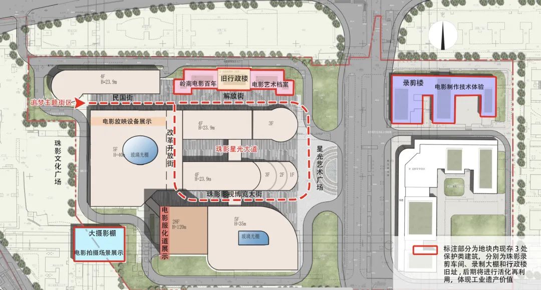 地块内现存的3处保护类建筑,曾见证珠影的“威水史”——珠影录剪车间、录制大棚、行政楼旧址,后期将活化再利用,体现工业遗产价值。
