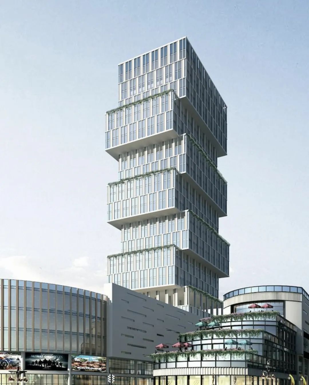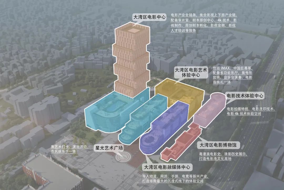 产业办公楼,建筑总高120米,建筑面积5万平方米。以电影胶片盒为创作灵感,凸显创意艺术气息,作为珠影集团总部及其子公司办公地,入驻影视制作、宣发、表演培训、金融服务等全套产业链、配备创意办公空间、公共会议室、审片播放厅等服务设施以及搭建众多产业服务平台,聚集电影产业的上下游企业和电影人才,形成产业规模、释放产业活力。 电竞动漫线下体验空间(面积:约10000m²),导入动漫、网游、手游、电竞等新兴产业,打造华南最大的沉浸式线下的体验空间,以及其周边产品售卖中心,聚焦年轻化的受众群体。面积约8000m²,拥有IMAX影厅、中国巨幕厅、VIP贵宾影厅、艺术影厅,不仅播放最新院线电影,同时可以点播珠影的优秀影片,定期在影院做小型影展,汇集国内外优秀电影作品,满足不同人群的观影需求。面积约2000m²,用于举办多种类型活动,根据会议、音乐会、LIVEHOUSE、新片发布,满足不同的使用场景。空间和硬件设施能满足乐团演出、典礼晚会、剧场等其他除电影放映以外的功能。面积约2700m²(不含室外空间),定位为大湾区的电影文化中心,通过“大博物馆”的定位理念,将博物馆展示分为主馆区和户外展示区,以电影文化内涵和设计元素联动整个园区,形成大湾区博物馆群。陈列展区:珠影厂史馆、粤港澳电影史、世界电影发展史;粤剧文化展、岭南纪录片档案馆、放映机展示区、经典电影海报荟萃展;互动体验区:战争场景体验区、电影服化道体验馆、电影未来科技体验馆;配套商业:珠影咖啡、电影文创书吧、电影主题餐厅、电影主题摄影。
