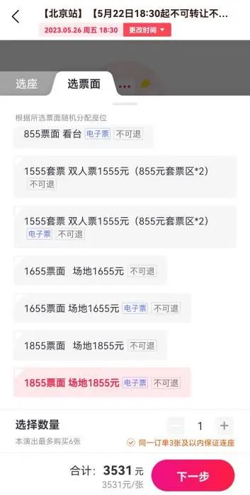 但同时,在演出票的二级市场中,各种演出票一直在售。 记者在某票务APP看到,五月天北京演唱会票价最低已达到1389元,而原票价最低是555元,溢价超过一倍;而现场原价1855元的票已涨至3531元。 某APP截图记者还以消费者的身份咨询某票务代理商家,商家发来的价格表显示,各区价格约是原票价的1.5倍左右。例如,内场855元档位目前报价1300元。