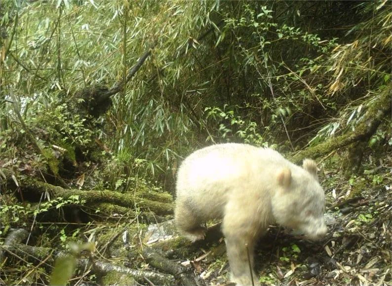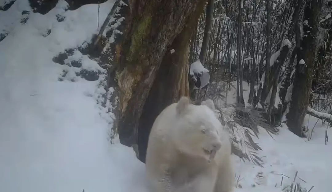 2019年4月,四川卧龙国家级自然保护区内,海拔2000米左右的一台野外红外触发相机首次摄录下一张白色大熊猫的侧影。此后近两年的时间里,红外触发相机拍到了这只白色大熊猫所有影像,或雪地漫步,或“打坐思考”,它穿过密林和小河沟,给人们留下的都是一个背影,或是一闪而过的臀背部。 在它的“自拍”照中,白色大熊猫看起来神情严肃,在它又圆又白的脸上,淡粉色的眼睛加上粉色眼眶显得十分可爱,没有黑眼圈,仿佛一只爱早睡早起的大熊猫。眼睛周围凸起的一圈白毛,视觉上有放大眼睛的效果。鼻子是倒三角的粉色,周围隐隐约约描了一圈黑线。2019年首次摄录的白色大熊猫侧影 而在另一组“他拍”视角中,白色大熊猫的眼睛受雪地阳光反射的影响,几乎睁不开,全身的毛发透着金白色,它扭动着胖乎乎的身体,四个脚掌则都是粉白色。 还有一段是,白色大熊猫身上披着一层白雪,与它的毛色融为一体,雪落在眼睛上,宛若天然的白色睫毛。迎面走来的它拖着一根竹子到树下,“咔哧咔哧”吃起来。拖竹子正面照 据悉,白化动物,是自然界的一个奇特的现象。我国古代史料中,便有了对白化鹿、白化熊、白化海龟、白化鸟类的记录。白化现象虽然罕见,但在脊椎动物各类群中广泛存在。白化通常是由于动物个体基因突变所致,使得动物体内色素合成受阻,在外部形态上呈现白色、金白色或浅金色。