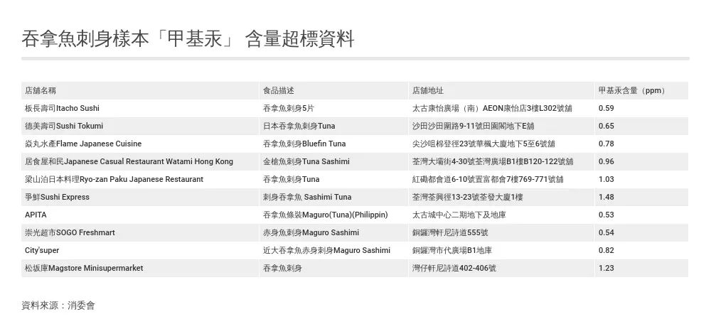 而「爭鮮」及「松坂庫」檢出的甲基汞含量更高於食品法典委員會為吞拿魚而設的上限每公斤1.2毫克。