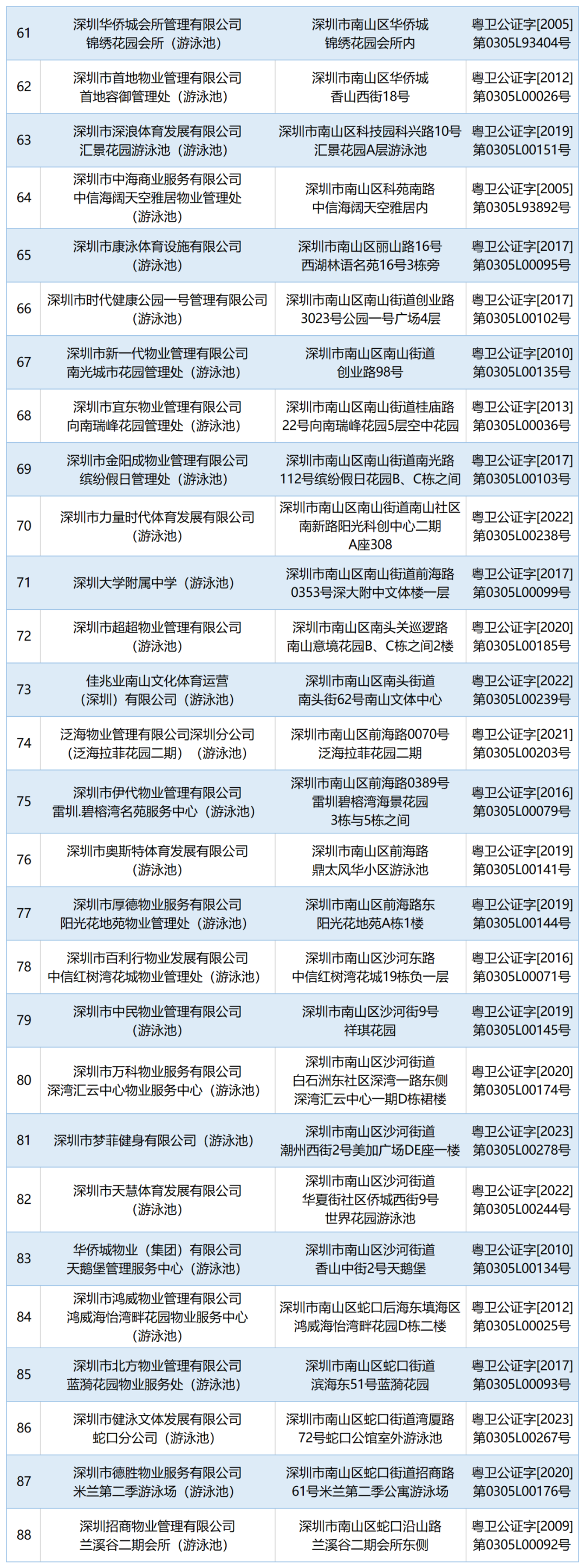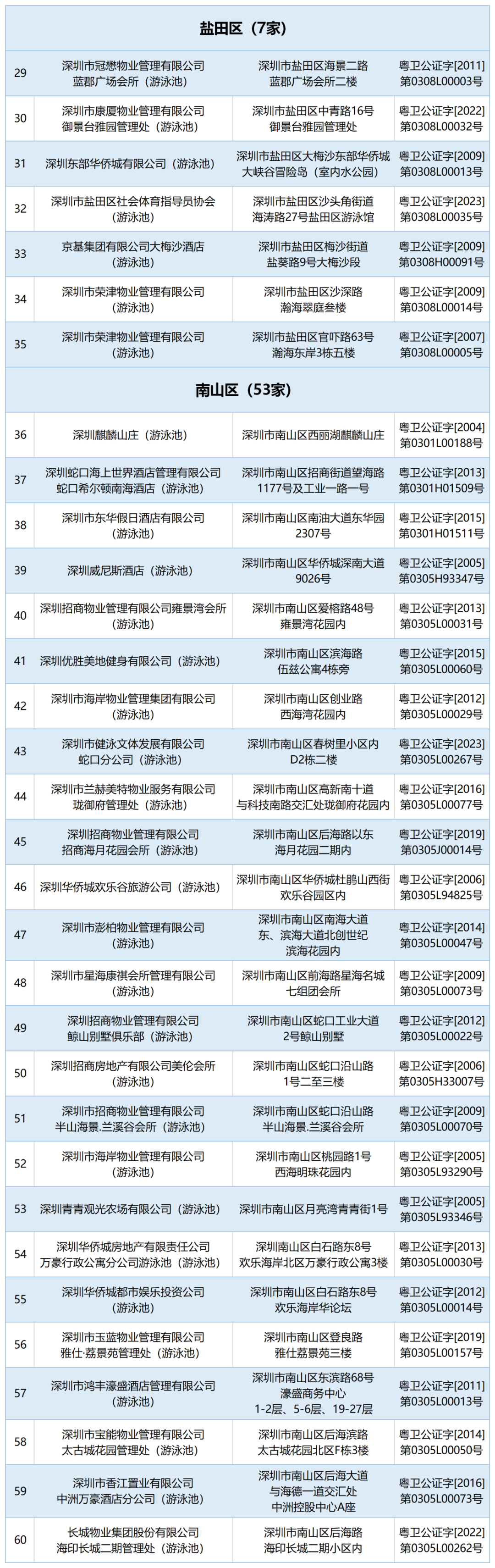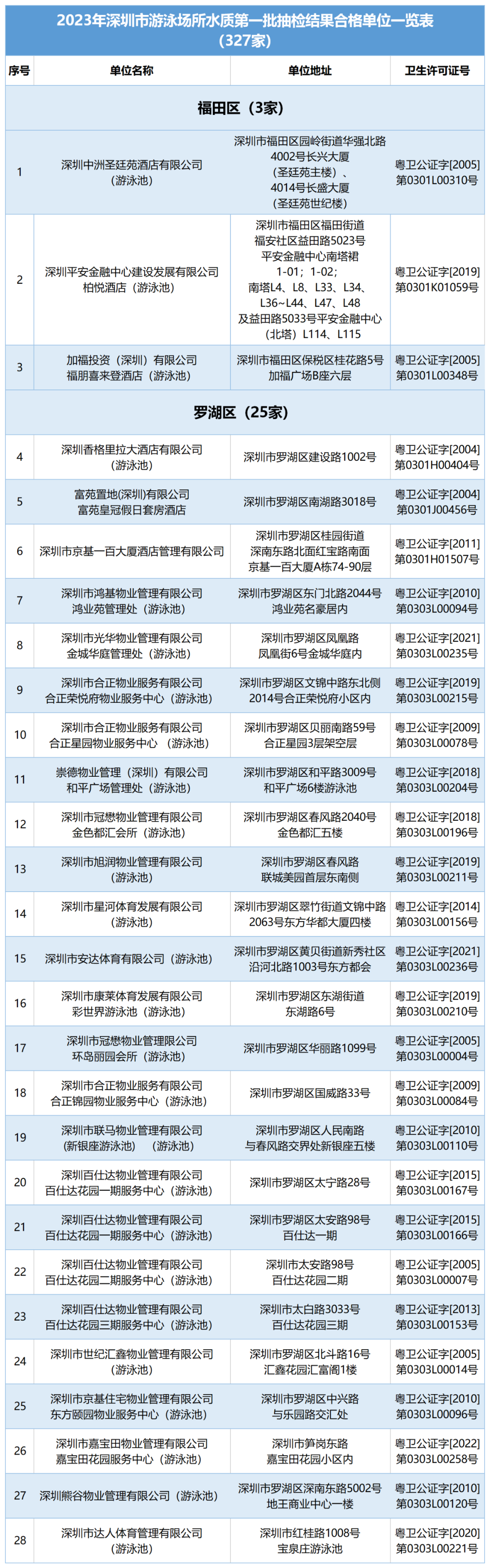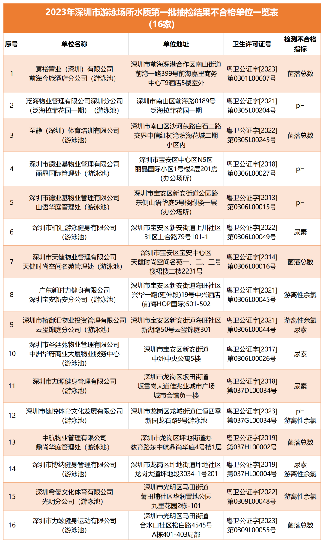 确认过眼神 大家都是“熟”人 最近深圳天气的热情 真的是势不可挡 因此 游泳成了很多小伙伴夏天的选择 但是你身边的游泳池水质都合格吗? 2023年 深圳游泳场所水质第一批抽检 结果出炉啦! 快来一起看看吧 深圳第一批游泳场所水质检测 16家场所不符合规定 夏日消暑,市民游泳热情高涨。深圳各泳池也都开门迎客。为确保泳池水质的卫生安全,根据《深圳市公共卫生“健安”系列专项2号行动计划——游泳场所卫生》部署,深圳市卫生健康委近期组织市、区卫生监督机构对全市对外营业的人工游泳场所水质进行了专项抽样检验。 2023年深圳市第一批 共抽检游泳场所343家 共检测游离性余氯、浑浊度、尿素 pH、菌落总数、大肠菌群等六项指标 其中——