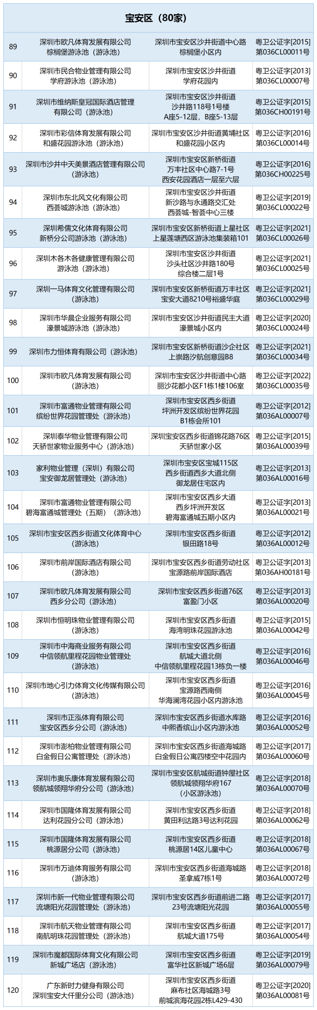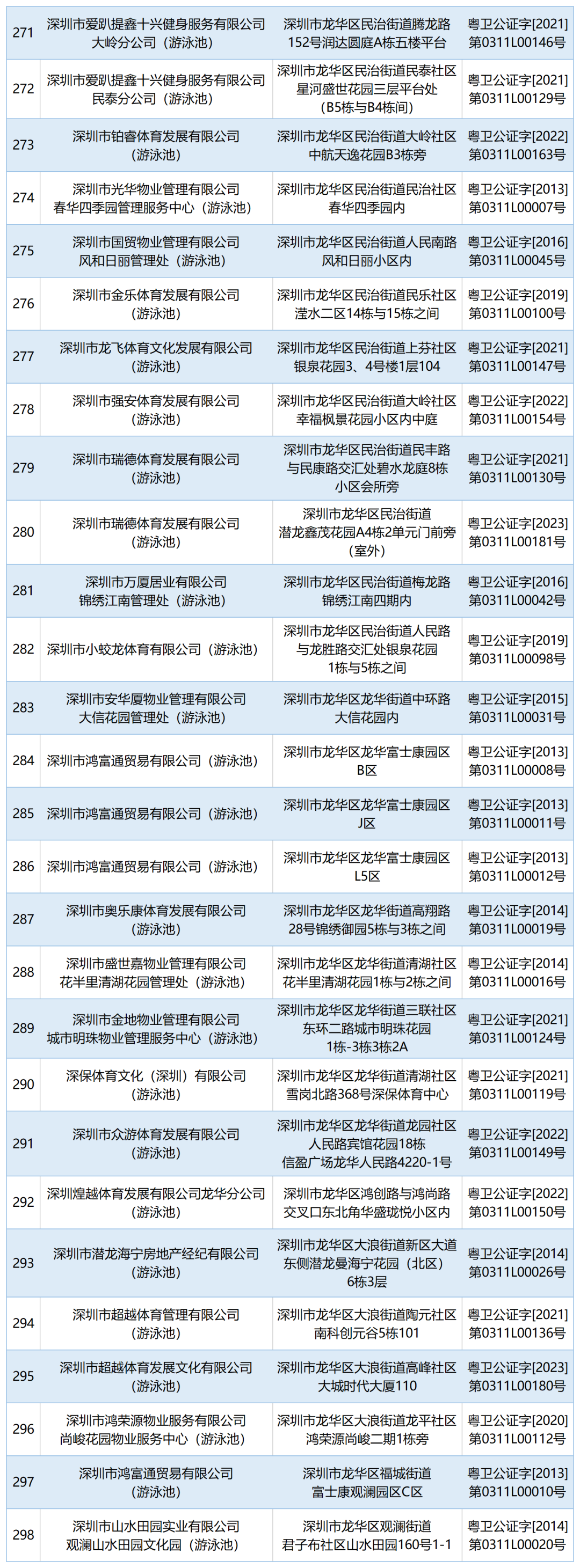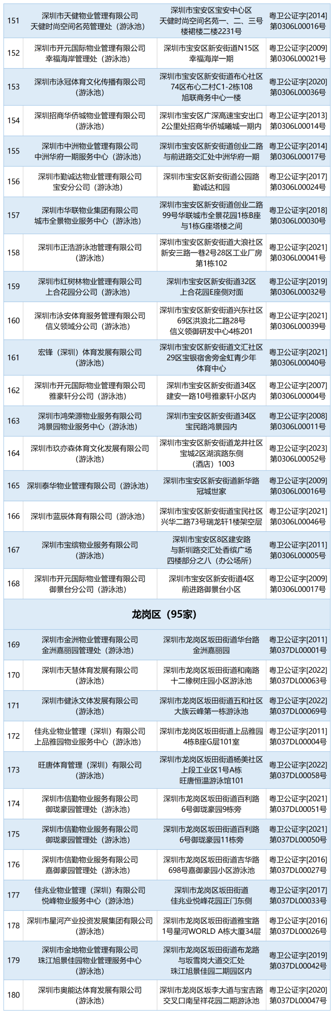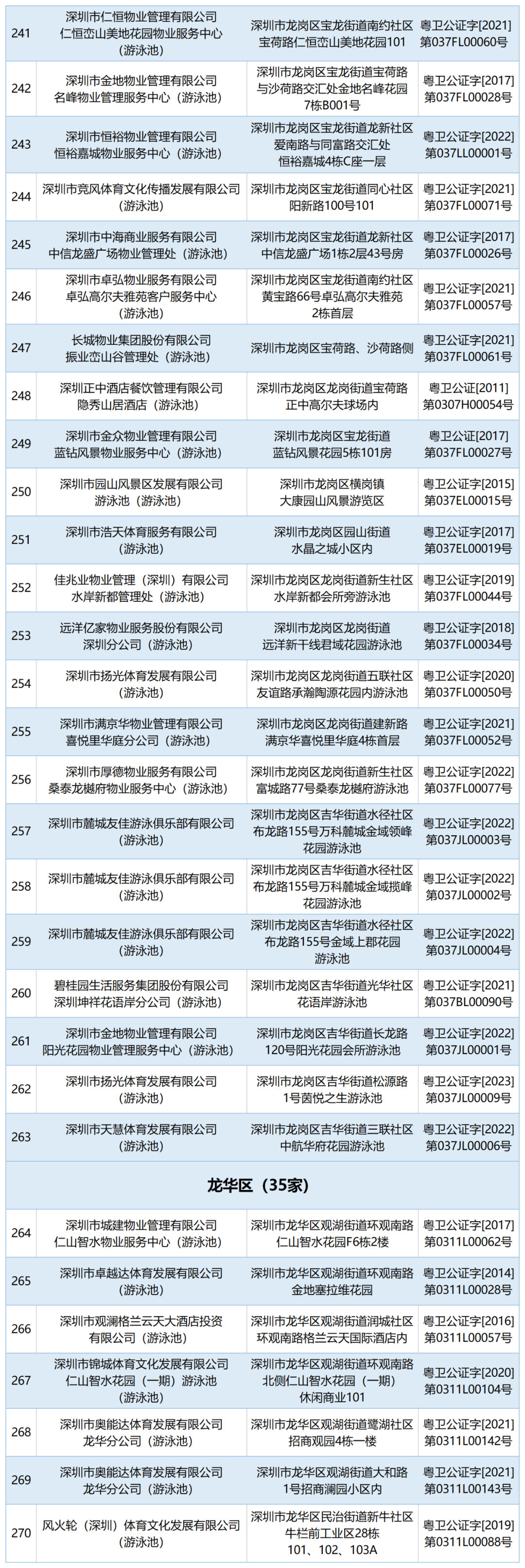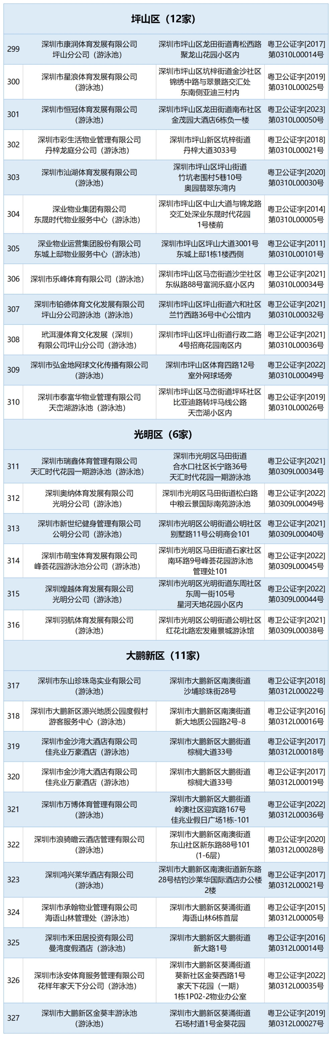 以下这327家游泳场所水质合格 小伙伴们可放心前往! ↓↓↓ *上下滑动查看更多* ▼ 再送上一些实用技能 赶紧get起来 去游泳,这些问题需注意 卫生监督部门提醒广大市民—— 泳客进入泳池前必须通过泳池设置的强制淋浴和浸脚池进行清洁和消毒,保持良好的卫生习惯。 凡患有肝炎、心脏病、皮肤癣疹、重症沙眼、急性结膜炎、中耳炎、肠道传染病、精神病和性病等疾病的患者和酗酒者,严禁进入游泳池游泳。 市民在游泳前要留意泳池是否持有有效的卫生许可证和水质检测报告,并可通过查看游泳场所量化分级级别、场所公示的每日水质自测数值,以及肉眼观察池水清澈度等方式,对游泳场所进行综合判断和选择。 暑假来了,不少孩子学游泳。南都资料图 夏季游泳卫生别忽视 游泳安全要重视 不说了 已经迫不及待要下水了! |