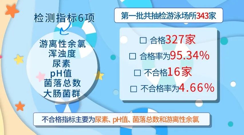 本次抽检不合格的指标主要为尿素、pH 值、菌落总数和游离性余氯。 对于本次抽检不合格单位,卫生监督部门已责令其立即整改,检测合格后方可对外营业。 接下来还将继续开展第二、第三批次的游泳场所水质抽检工作,确保全市泳池水质抽检工作覆盖率达到100%。 16家不合格场馆名单 那么这些指标都是什么意思呢? 它们都反映了什么问题? 让我们来了解一下 检测指标反映池水水质状况 菌落总数是衡量池水循环净化处理系统运行质量和灭菌效率的重要指标,均反映了泳池水的消毒情况。卫生监督部门将严查泳池的投药及设备运转情况,并要求泳池做好每日的泳池水消毒以及相应记录。 pH值指标的国家标准卫生要求是7.0~7.8,在此范围内能保证泳池水中消毒剂的活性,使含氯消毒剂消毒效率最高,可通过足够的补水量进行调节。 尿素,主要来自人体的汗液、分泌物和排泄物,是反映游泳池水新鲜程度的一项指标,可以通过每天添加新水稀释来控制。对尿素超标的游泳场所,卫生监督部门将严查泳池的补水量,并要求泳池做好相应的检查记录。 游离性余氯主要反映消毒活性物质对泳池水的持续消毒能力,我国《公共场所卫生指标及限值要求》(GB 37488-2019)明确规定,池水中游离性余氯应控制在0.3~1.0毫克/升 ,既能达到消毒效果,也不会对人体产生危害。 那么,平时我们应该如何 选择靠谱的游泳场所呢? 选择游泳场所小妙招 市民朋友在选择游泳场所时,可以留意——