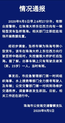 关于9·5珠海大桥货车坠海事故情况的通报