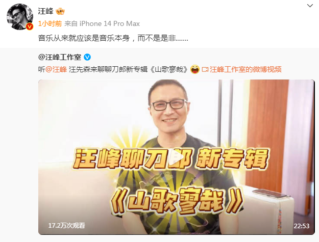 “那马户不知道它是一头驴,那又鸟不知道它是一只鸡。勾栏从来扮高雅,自古公公好威名。” 近日,刀郎发行新专辑《山歌寥哉》,其中新歌《罗刹海市》引发网友关注和热议。这首新歌,被网友解读成“歌词一口气内涵了那英、汪峰、杨坤等娱乐圈明星”。 2日,汪峰对此做出了回应,并和大家聊起了刀郎的新专辑《山歌寥哉》,他表示:“音乐从来就应该是音乐本身,而不是是非……” 汪峰对于刀郎的这张专辑做出了详细和专业的分析,视频时长20多分钟。 在视频开头,汪峰否认了对刀郎有任何的偏见,或者觉得与他有什么高下之分,并表示在这二十年中刀郎除了做音乐外,没有传出过其他的消息,就这一点自己对他十分尊重。 “我看到网友在说,文章也在说,20年前我对刀郎的评价,我觉得完全没有意义去谈论和解释。”他说,但是最近想到了家人和孩子,就觉得为什么要让别人误解他? 汪峰称,在记忆中,他从来没有对刀郎有过任何的偏见,自己一向对于做音乐的人不是这种态度。 他举例称,甚至有一篇文章把他的毕业院校都写错了。“连基本常识都没有,后面也就不需要看了。” 在辟谣完网上的传言后,汪峰从专业的角度对刀郎的新专辑进行了分析,谈到里面自己最喜欢的歌曲并不是最火爆的《罗刹海市》,而是《未来的底片》,除此之外,他还喜欢《花妖》《镜听》《路南柯》,并夸赞刀郎在这张专辑中完美结合了中西方音乐的特点。如果是百分制的话,自己会给他打93分,是“相当相当的不错”。 汪峰表示,对于这张专辑不要上纲上线,不要去赋予太多道德的东西,如果刀郎的作品有让人去思考,这就是创作者给我们最大的益处,不要把一件事歪曲变性质。 汪峰表示,当下有人说刀郎用了一首歌去讽刺、甚至报复某些人,这种说法非常贬低刀郎。 “把这种莫须有的观点强加于大众,自己的心理是阴暗的。因为任何音乐不是是非,不是道德审判。” 最后,汪峰还强调,现在所谈论的不是解释,只是提醒大家去尊重一个好的音乐,去尊重一个好的音乐家,不要给纯粹的东西强加一些东西。汪峰称还有一些更专业的知识没有和大家分享,如果刀郎能看到这段视频,相信他会知道自己是懂他的音乐的。 在汪峰之前,杨坤作了回应。 有网友发文评论《罗刹海市》所带来的舆论风波,表示不认同网友们“网暴”那英、杨坤等人。“别绑架底层了,被你骂的也是底层,罗刹海市这歌可能骂的就是你哦。” 7月28日,杨坤在这条博文的后面发布了评论:“最后一句说对了。” 有网友分析,难道杨坤是说,刀郎在新歌里骂的不是杨坤等人,而是在骂所谓“底层”的网友们? 7月29日,刀郎经纪方表示,关于《罗刹海市》不会有公开回应。 文章来源于钱江晚报,如有侵权请联系删除。本文仅代表作者观点,不代表大湾网的观点立场。 |
