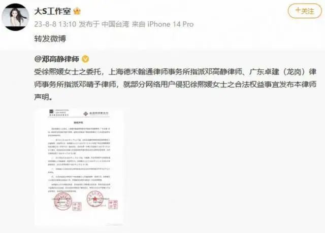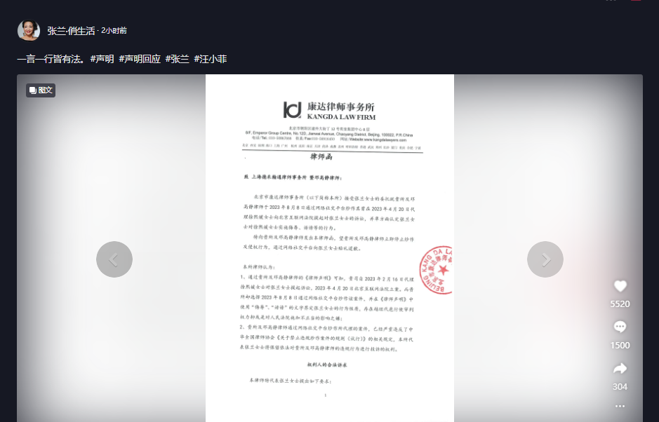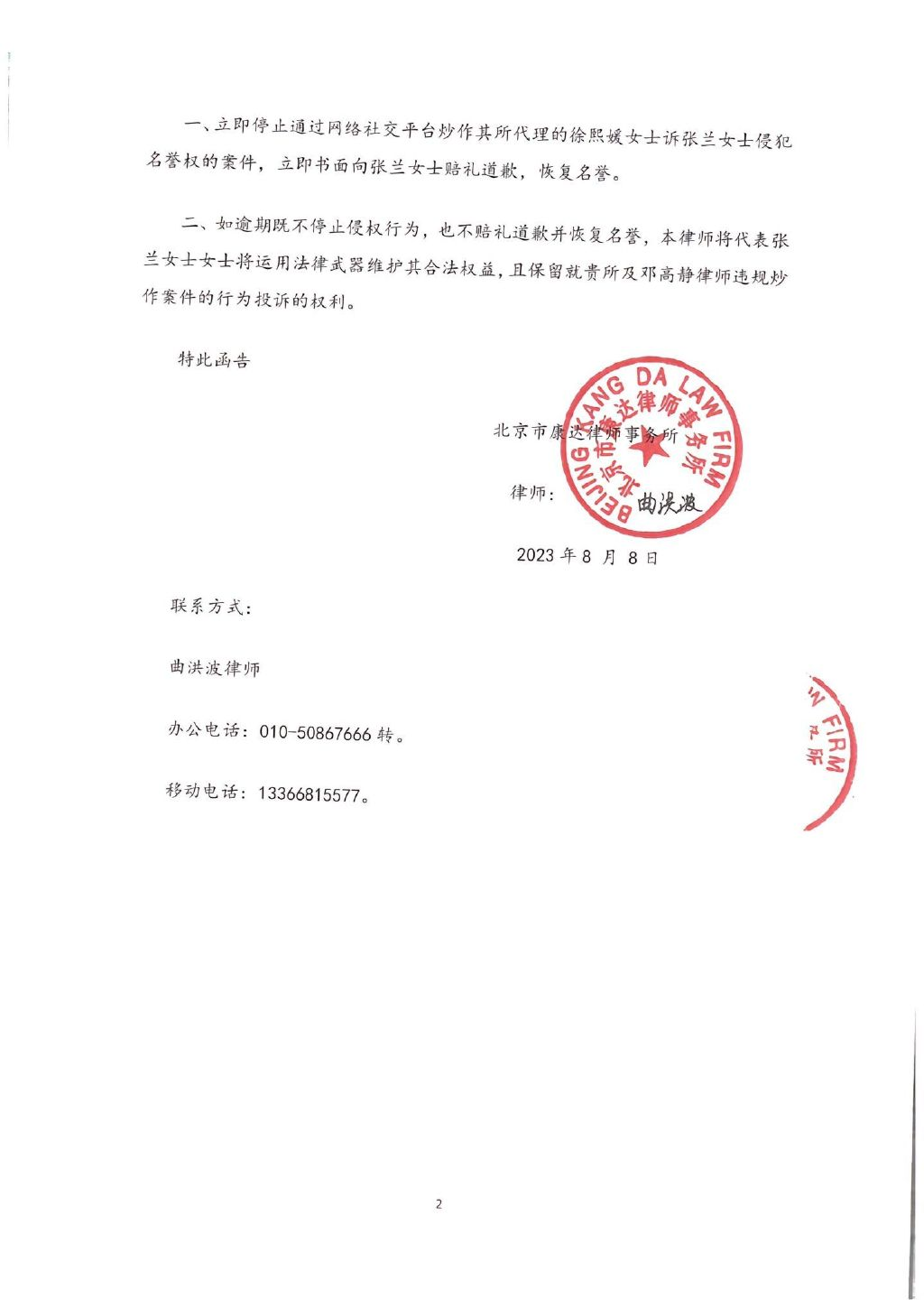 8月8日晚,张兰发律师函回应被大S起诉一事,并表示,“一言一行皆有法。” 律师函提到,该诉讼在4月立案,但对方在今天使用侮辱、诽谤等文字界定张兰,“存在越俎代庖行使审判权力亦或是对人民法院施加不正当的影响之嫌。” 全文如下: 致上海德禾翰通律师事务所 暨邓高静律师: 北京市康达律师事务所(以下简称本所)接受张兰女士的委托就贵所及邓高静律师于2023年8月8日通过网络社交平台炒作其曾在2023年4月20日代理徐熙媛女士向北京互联网法院提起对张兰女士的诉讼,并单方面认定张兰女士对徐熙媛女士实施侮辱、诽谤等的行为。 特向贵所及邓高静律师发出本律师函,望贵所及邓高静律师立即停止炒作及侵权行为,通过网络社交平台向张兰女士赔礼道歉。 本所律师认为: 1、通过贵所及邓高静律师的《律师声明》可知,贵司自2023年2月16日代理徐熙媛女士对张兰女士提起诉讼,2023年4月20日北京互联网法院立案。而贵所却选择2023年8月8日通过网络社交平台炒作该案件,并在《律师声明》中使用“侮导”“诽谤”的文字界定张兰女士的行为性质,存在越俎代庖行使审判权力抑或是对人民法院施加不正当的影响之嫌; 2、贵所及邓高静律师通过网络社交平台炒作所代理的案件,已经严重违反了中华全国律师协会《关于禁止违规炒作案件的规则(试行))的相关规定,本所代表张兰女士将保留依法对贵所及邓高静律师的违规行为进行投诉的权利。 权利人的合法诉求 本律师特代表张兰女士提出如下要求: 一、 立即停止通过网络社交平台炒作其所代理的徐熙媛女士诉张兰女士侵犯名誉权的案件,立即书面向张兰女士赔礼道歉,恢复名誉。 二、如逾期既不停止侵权行为,也不赔礼道歉并恢复名誉,本律师将代表张兰女士女士将运用法律武器维护其合法权益,且保留就贵所及邓高静律师违规炒作案件的行为投诉的权利。 此前消息 8月8日 声明中称张兰、汪小菲自2022年11月21日起,在网络平台持续性地对徐熙媛女士实施侮辱、诽谤等行为。对此徐熙媛已经提起诉讼,北京互联网法院已立案。 而针对其他部分网络用户对徐熙媛女士实施的侮辱、诽谤行为,徐熙媛已委托律师完成取证工作,将根据实际情况采取进一步的法律措施。 在声明最后,徐熙媛呼吁大家理性发言,共同营造良好的网络环境。 2010年11月16日大S、汪小菲在北京市朝阳区民政局登记结婚。2011年3月22日,大S、汪小菲在海南三亚举行婚礼。2021年11月22日,大S通过媒体发表律师声明,表示两人已决定和平解除婚姻关系。2022年3月,大S官宣与具俊晔再婚。 自从大S和汪小菲离婚,和具俊晔结婚后,这两家人之间的闹剧就没有停止过。 |