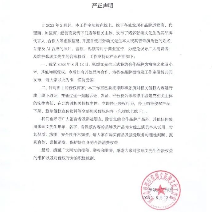 近日,有不少网友反映,在线上及线下发现了一些关于张颂文的虚假代言信息。8月12日晚,张颂文工作室就此事发布严正声明。 声明称,自2023年2月起,工作室陆续在线上线下各处发现有品牌运营商、代理商、加盟商、经销商及线下门店等相关主体,发布张颂文为其代言人、合作人的虚假消息,并擅自将张颂文本人或其曾饰演角色的姓名、肖像及AI合成的照片、音频、视频等用于商业宣传。工作室公布的图片显示,这些虚假代言信息涵盖食品、护肤品、电动车、酒业、线下餐厅等多个领域及品牌。声明称,针对上图中的侵权商家,工作室已委托律师对侵权内容进行线上线下取证,并通过逐一提起诉讼、发函、平台投诉等法律手段追究相关主体的法律责任。要求相关侵权主体立即停止侵权行为、停止销售侵权产品,下架、删除包括线上线下的侵权宣传物料等全部相关侵权内容。张颂文,1976年5月10日出生于广东省韶关市 ,中国内地影视男演员、表演指导,毕业于北京电影学院。2004年,因主演情景喜剧《乘龙怪婿》而正式出道。2022年,凭借历史片《革命者》中“李大钊”一角获得电影频道传媒荣誉之夜最受传媒关注男主角奖。2023年1月14日,领衔主演的反黑刑侦剧《狂飙》播出,同年主演电影《第八个嫌疑人》。