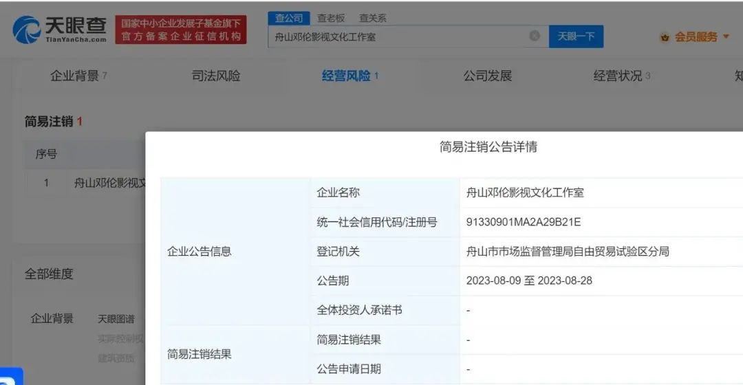 据天眼查App显示,近日,舟山邓伦影视文化工作室新增简易注销公告,公告期自8月9日至8月28日。该工作室成立于2018年3月,为邓伦个人独资企业,出资额100万人民币,经营范围含影视文化艺术活动交流策划,影视文化领域内的技术开发、技术服务、技术咨询等。 天眼查显示,邓伦名下共存在两家个人独资工作室,其中邓伦(上海)影视文化工作室已于今年4月注销。 邓伦,1992年10月21日出生于河北省石家庄市,中国内地影视男演员。曾出演《花非花雾非雾》《欢乐颂2》《楚乔传》《香蜜沉沉烬如霜》等影视作品。2022年3月,上海市税务局第四稽查局依法对邓伦偷逃税案件进行处理。 文章来源于潇湘晨报,如有侵权请联系删除。本文仅代表作者观点,不代表大湾网的观点立场。 |