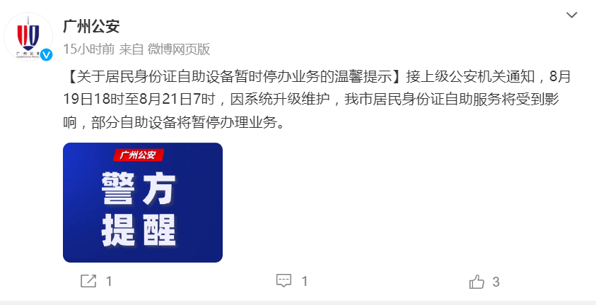 8月18日晚,广州警方发布温馨提示:接上级公安机关通知,8月19日18时至8月21日7时,因系统升级维护,广州市居民身份证自助服务将受到影响,部分自助设备将暂停办理业务。