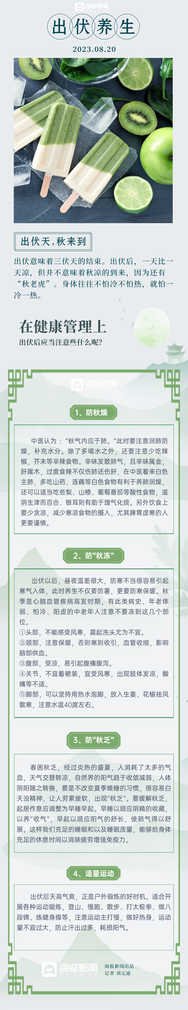 长达40天的三伏天 终于结束 昨日(8月20日)正式出伏 送走三伏,清凉可期? “三伏适已过,骄阳化为霖。”新一轮降雨做客广东。 送走三伏,雨水助阵,是否意味着已进入降温凉爽模式?并没有。21日至23日,广东大部多云间晴天气为主,有分散雷阵雨,局部大雨或暴雨,各地气温上升,天气炎热。 具体预报 21日,韶关、清远、肇庆北部多云有雷阵雨,局部大雨,其余市县多云间晴,有分散雷阵雨。最高气温:粤西、珠三角33℃~35℃,其余市县31℃~34℃。 22日到23日,广东省大部多云到晴,有分散雷阵雨。最高气温:粤西、珠三角33℃~36℃,其余市县31℃~34℃。 广东天气提醒,注意防范局地短时强降水、雷暴大风、雷电等强对流天气及其可能造成的户外劳作、旅游、交通安全风险以及建筑施工设备、户外广告牌、临时搭建物和危旧房屋等倒塌风险,以及可能诱发的山洪及泥石流等地质灾害,并注意防范城乡积涝、农田渍涝等灾害。 很大程度上取决于“秋老虎” 是否发威 “秋老虎”是指出伏后短时间会热到35摄氏度以上的天气,它大多发生在每年公历8月下旬至9月上旬,气候特征是早晚稍清凉,午后则高温暴晒。 在等待“秋老虎”降临的日子,也别掉以轻心。因为,从8月20日(出伏)到9月23日(秋分),这是一年中气温波动最大、波动最频繁的“最凶险”日子。 “伏包秋,凉飕飕;秋包伏,热死牛。”一句民谚,已然唱出了这段日子的变幻无常和“凶险莫测”。 此时节,大部分地区温差增大、昼暖夜凉,很多疾病易在这段夏秋交替之际出现。 “多病之秋” 顺应天时调养生息尤为重要 下面这份小贴士请收好 文章来源于广东禁毒,如有侵权请联系删除。本文仅代表作者观点,不代表大湾网的观点立场。 |