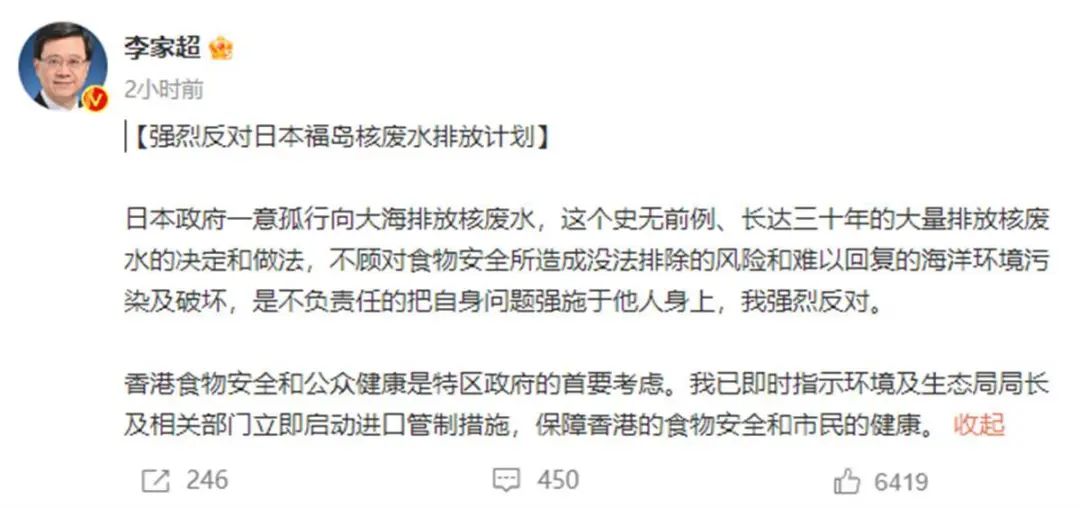 据@大湾区之声微博消息,香港特区政府环境及生态局局长谢展寰今日(22日)表示,特区政府决定自8月24日开始,禁止源自东京、福岛、千叶、栃木、茨城、群马、宫城、新潟、长野和埼玉10个都、县的水产品进口,包括所有活生、冷冻、冷藏、干制或以其他方式保存的水产品、海盐,以及未经加工或经加工的海藻。 综合NHK、共同社报道,日本政府宣布将从8月24日开始,将福岛第一核电站核污染水排放入海。22日,香港特首李家超在微博官方账号上发文,表示强烈反对日本福岛核污水排放计划。 李家超微博截图 李家超指出,日本政府一意孤行,向大海排放核污水,这个史无前例、长达30年的大量排放核污水的决定和做法,不顾对食物安全所造成无法排除的风险和难以恢复的海洋环境污染及破坏,是不负责任地把自身问题强施于他人身上,他表示强烈反对。 李家超指出,香港食物安全和公众健康是特区政府的首要考虑。他已指示环境及生态局局长及相关部门立即启动进口管制措施,保障香港的食物安全和市民的健康。 据《文汇报》报道,特区政府早前表示,一旦日方启动排放核污水,港方会即时禁止源自东京等10个都县的水产品进口。有香港餐饮行业人士表示,近期受日本核污水排放消息的影响,已有不少食客对日本食物失去信心,预计日料店生意额大跌近七成。 |