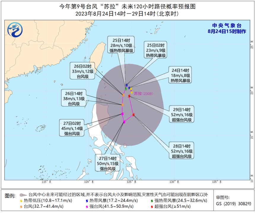 中央气象台24日15时制作的“苏拉”路径和强度预报
