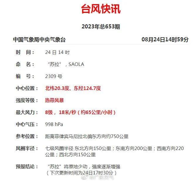 根据中央气象台观测,“苏拉”24日14时位于北纬20.3度、东经124.7度,距离菲律宾马尼拉北偏东方向约750公里,中心附近最大风力8级(18米/秒,约65公里/小时),达到热带风暴级别。