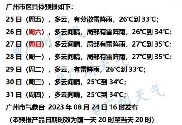 据@广东天气 预计,未来三天,受低层弱的偏南气流影响,广东省大部多云为主,有雷阵雨,局地(大)暴雨,雷雨时伴有短时强降水和雷暴大风;各地气温上升,天气日趋炎热,部分市县有35℃~36℃高温。具体预报如下:25日,南部市县多云,有雷阵雨,局部暴雨,其余大部分市县晴到多云,午后有分散雷阵雨。最高气温:南部沿海市县31℃~33℃,其余市县34℃~36℃。 26日,粤西和珠三角多云,有雷阵雨,其余大部分市县晴到多云,午后有分散雷阵雨。最高气温:南部沿海市县32℃~33℃,其余市县34℃~36℃。27日,全省大部晴到多云,午后有分散雷阵雨。最高气温:南部沿海市县32℃~33℃,其余市县34℃~36℃、部分市县37℃。