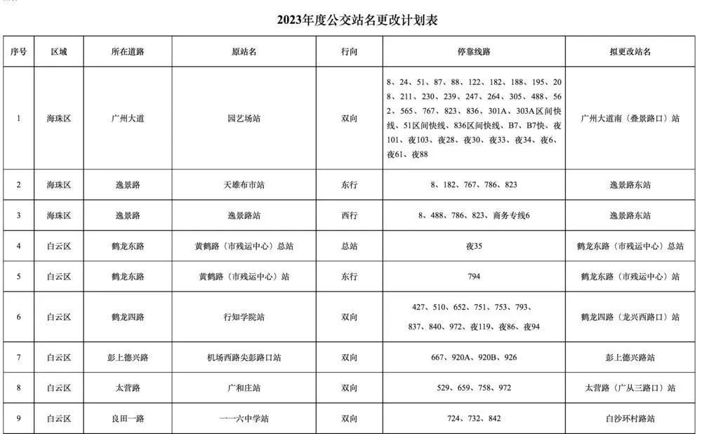 广州市交通运输部门近日发布消息,为规范公交站点名称,方便市民公交出行,结合《2023年度公交站点更名计划》,将更改公共汽车园艺场站等38个公交站点站名。本次站点更名涉及17对站、3个单边站点、1个总站,自9月1日开始实施,11月30日前完成。 根据《2023年度公交站名更改计划表》,本次更名的公交站点分布于海珠区、白云区和越秀区。其中,海珠区更名的公交站点为园艺场站,更名为广州大道南(叠景路口)站,天雄布市站和逸景路站更名为逸景路东站,更名的原因为“站点名称对应标志物已不存在”。 越秀区更名的公交站点为市八医院(肝病医院)站,由于市八医院(肝病医院)已搬迁至白云区,站名指示不明,所以更名为先烈南路口站。 除了海珠区和越秀区,剩余更名的公交站点均位于白云区,更名的原因有站点所在道路更名、站点名称对应标志物已不存在或更名、站点名称对应标志物已失效、站点名称与实际地名不符等原因。 例如,因为站点所在道路已更名为鹤龙东路,黄鹤路(市残运中心)总站更名为鹤龙东路(市残运中心)总站;广和庄站更名为太营路(广从三路口)站,原因为站点名称对应标志物已不存在;苦板塘站更名为菰坂塘站,吉洞站更名为桔洞站,均因为站点名称与实际地名不符。 与此前广州市交通运输部门发布的《关于征求2023年度公交站点站名更改意见的通告》不同,本次更名增加了对白云区行知学院站的更名计划,将其双向车站更名为鹤龙四路(龙兴西路口)站。 征求意见通告中,拟将大朗工业路(大朗市场)站(双向)更名为大朗横路北站,现更名为朗兴路北(大朗市场)站;征求意见通告中,拟将大朗工业路口站更名为大朗横路口站,现更名为朗兴路站。 广州市交通运输局官网截图 文章来源于羊城晚报,如有侵权请联系删除。本文仅代表作者观点,不代表大湾网的观点立场。 |