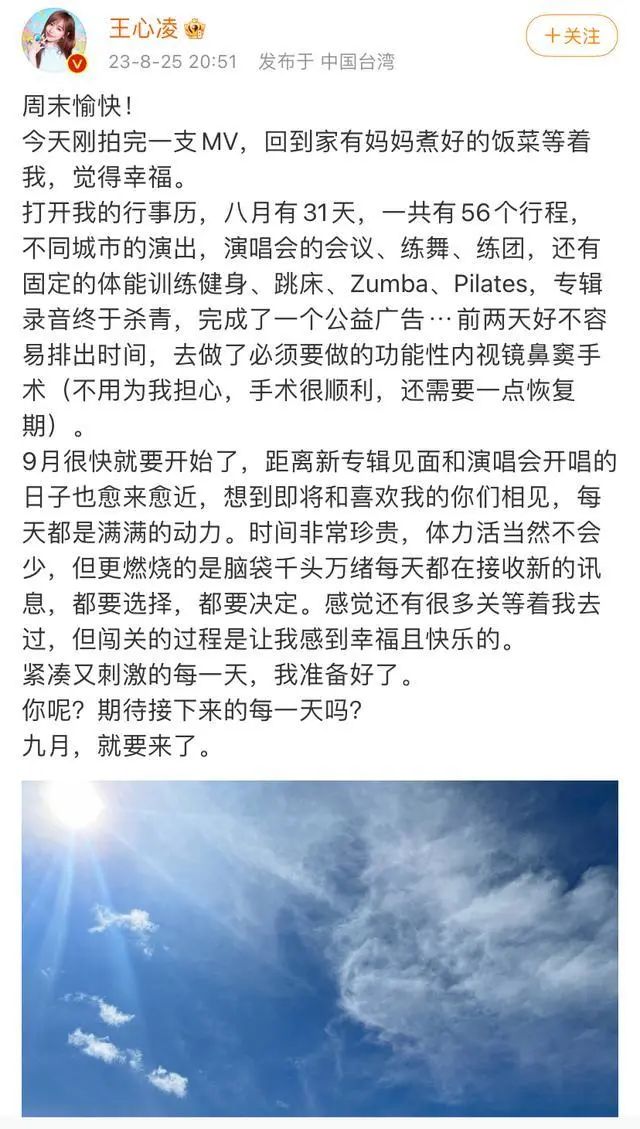 8月25日晚 王心凌发文分享了自己的近况 她透露在八月这31天中 她有56个行程 其中包括不同城市的演出 演唱会的会议、练舞、练团 还有固定的体能训练如健身 跳床、尊巴、普拉提 杀青了专辑录音 完成了一个公益广告的拍摄等 直到忙到前两天 王心凌才好不容易排出时间 去做了必须要做的功能性 内视镜鼻窦手术 并报平安: “不用为我担心,手术很顺利, 还需要一点恢复期”。 而面对同样充实的九月 王心凌表示自己准备好了 王心凌是歌手、演员。凭借甜美的长相和歌声,她被网友誉为“甜心教主”。 2022年,王心凌参加综艺节目《乘风破浪第三季》,并夺得年度总冠军。 翻红后的她在收获超高人气的同时,工作强度也随之增加。 听到王心凌做手术的消息后,网友表示:“注意身体,照顾好自己”。 文章来源于潇湘晨报,如有侵权请联系删除。本文仅代表作者观点,不代表大湾网的观点立场。 |