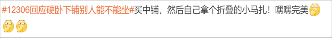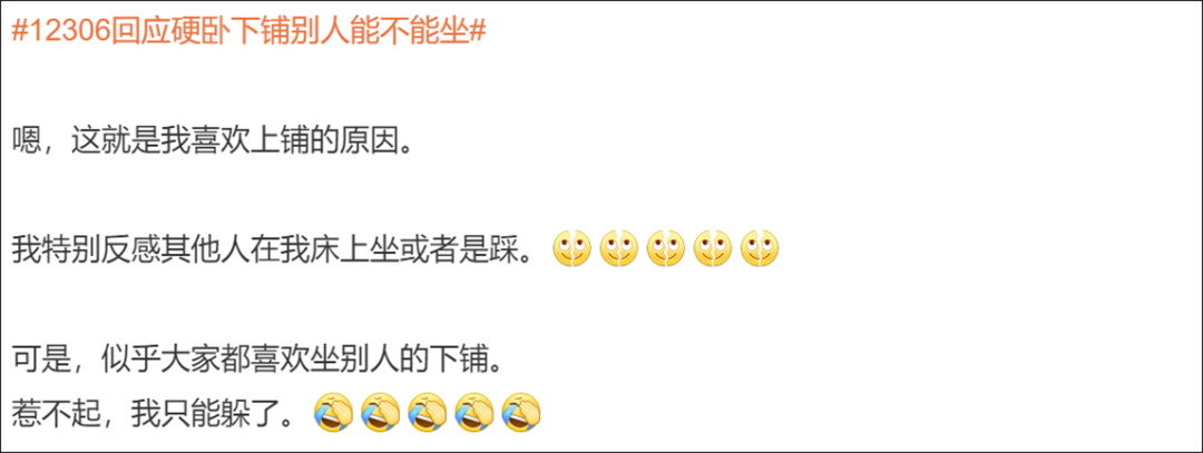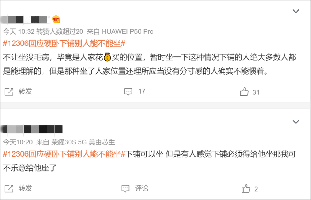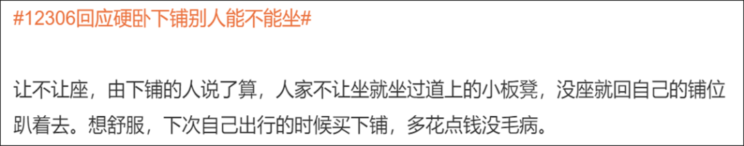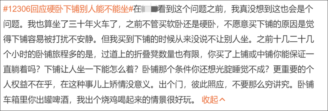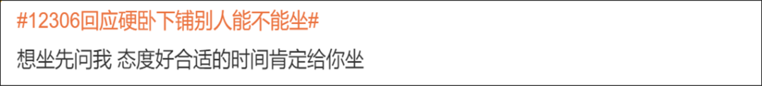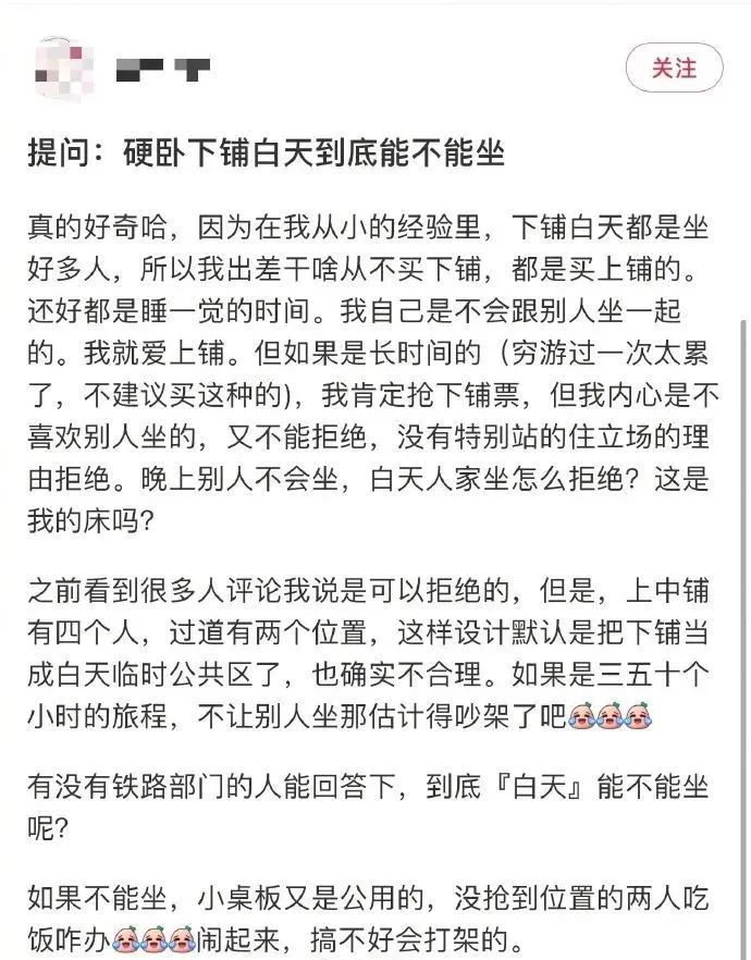 自己买到下铺票 内心不喜欢别人坐 好像又没有 特别站得住立场的理由拒绝 “这是我的床吗?” 12306客服称 铁路部门并没有明令禁止自带床帘 自带床帘属于乘客个人行为 “先询问,态度好时间合适是可以让坐下的” “不让人坐下铺也没毛病,毕竟自己花钱买的 有人暂时坐一下可以理解” “那些理所应当坐下铺没有分寸感的人 不能惯着” 还有人另辟蹊径 “买中铺自带小马扎就好 完美避免问题” “还是喜欢上铺,惹不起躲得起” “矫情没意义 出门在外大家彼此照应 下铺让人坐一下能怎么样? 不要穷讲究” 不允许其他人坐,合情合理 如沟通不顺,没必要不依不饶 乘客购买车票后 享有位置使用权限 购买了硬卧下铺 本身车票就比别的座次要贵一点 乘客不允许其他人坐 也是合情合理的 大家出门在外 如果有需求真的想坐一会下铺 好好沟通 想必大多数乘客都是愿意的 此外 列车过道上也有其他座位 方便乘客休息 如果沟通不顺 也没必要不依不饶