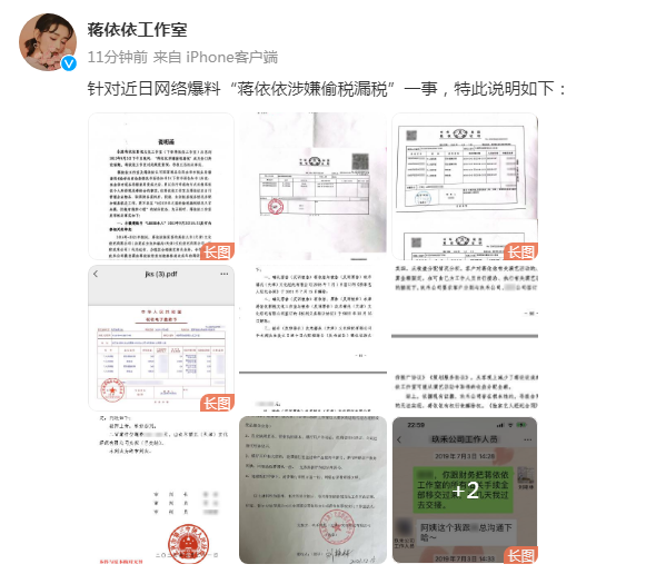 9月4日下午,针对近日网络爆料“蒋依依涉嫌偷税漏税”一事,@蒋依依工作室 发布声明回应。