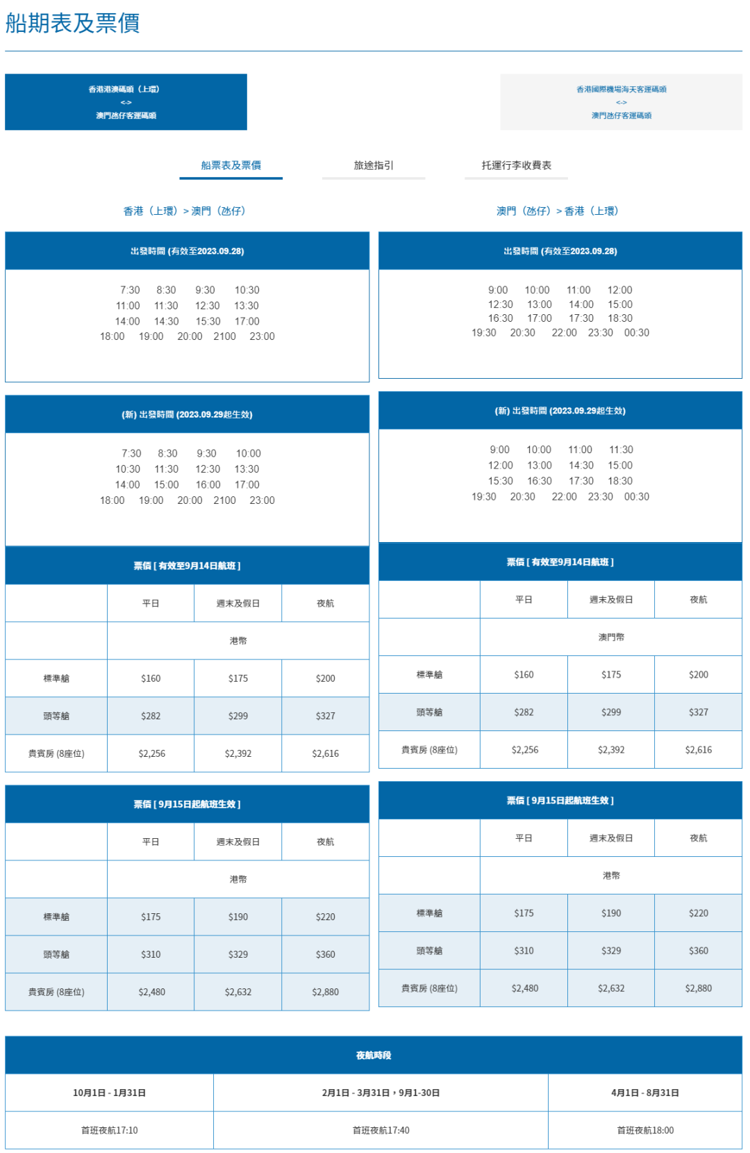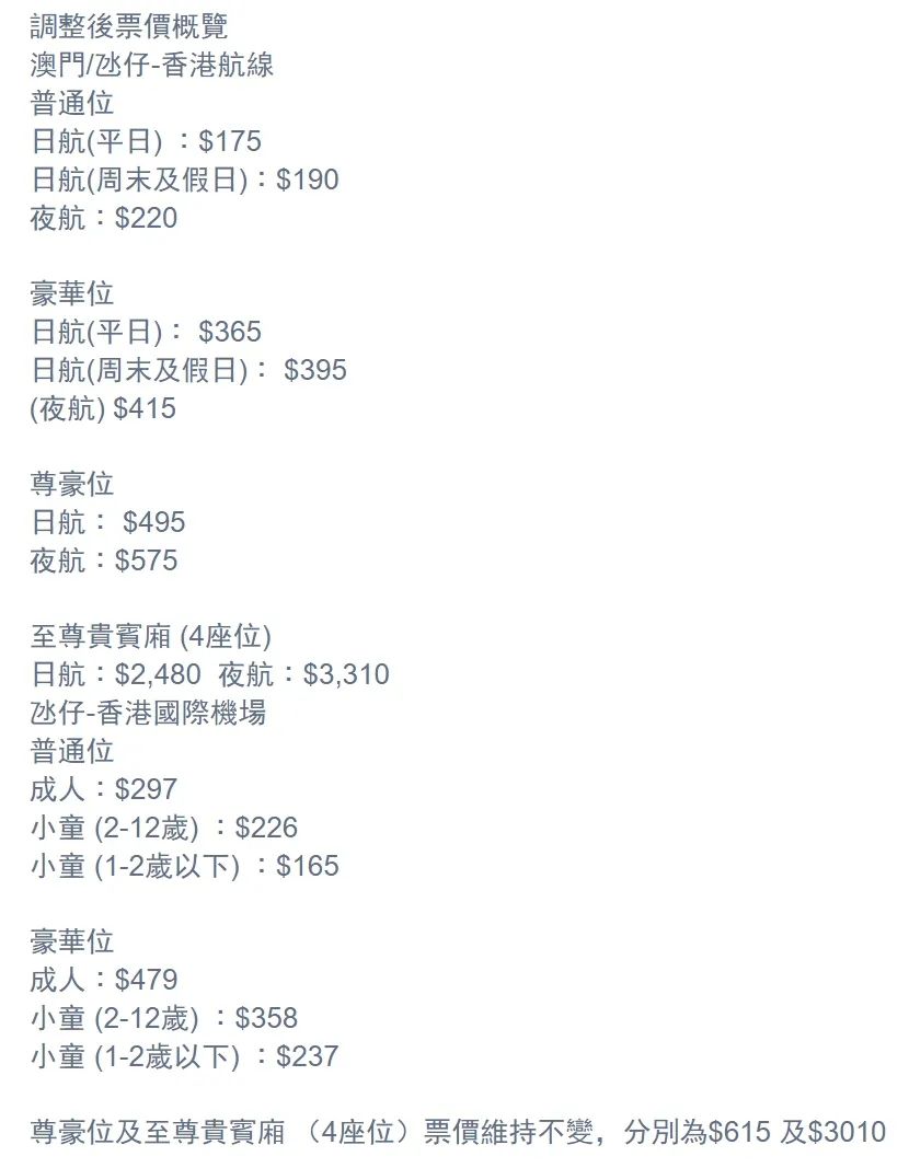 来往港澳的船票周五起加价 调整后日航为175元起 日均客量可达8万至9万人 喷射飞航及金光飞航均宣布,来往港澳的船票周五起加价。调整后日航为175元起,夜航则加至220元 喷射飞航表示,获澳门政府批准调整澳门/氹仔往返香港航线,以及往返澳门及香港国际机场航线船票票价,票价调整加幅为8.5%至10%不等。是次为喷射飞航继2017年后首次票价调整,新票价将由2023年9月15日起生效。 同时喷射飞航亦将于2023年9月15日至12月15日推出港澳航线船票价优惠,乘客于喷射飞航网站选购e-boarding来回船票可享9折优惠。有关优惠详情,请留意官方网页适时公布。