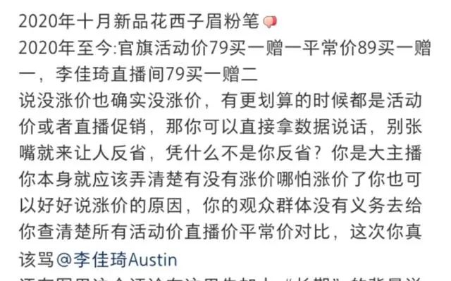 昨夜今晨, 究竟怎么回事? 原来在李佳琦带货 “不要乱说, 眉笔一直79元,国货很难的。 有时候找找自己原因, 这么多年工资涨没涨, 有没有认真工作。” 不少网友愤慨道 “你可以解释为什么这么贵, 但不能攻击消费者吧, 这多少上升到人身攻击了。” 但也有网友表示 该款花西子眉笔 在李佳琦直播间的价格为79.9元, 买一支送两支替换装。 也有博主整理出该款眉笔往年的价格。该款眉笔为2020年新品,官旗活动价一直为79元买一赠一,平常价为89元买一赠一。在李佳琦的直播间79元买一赠二。