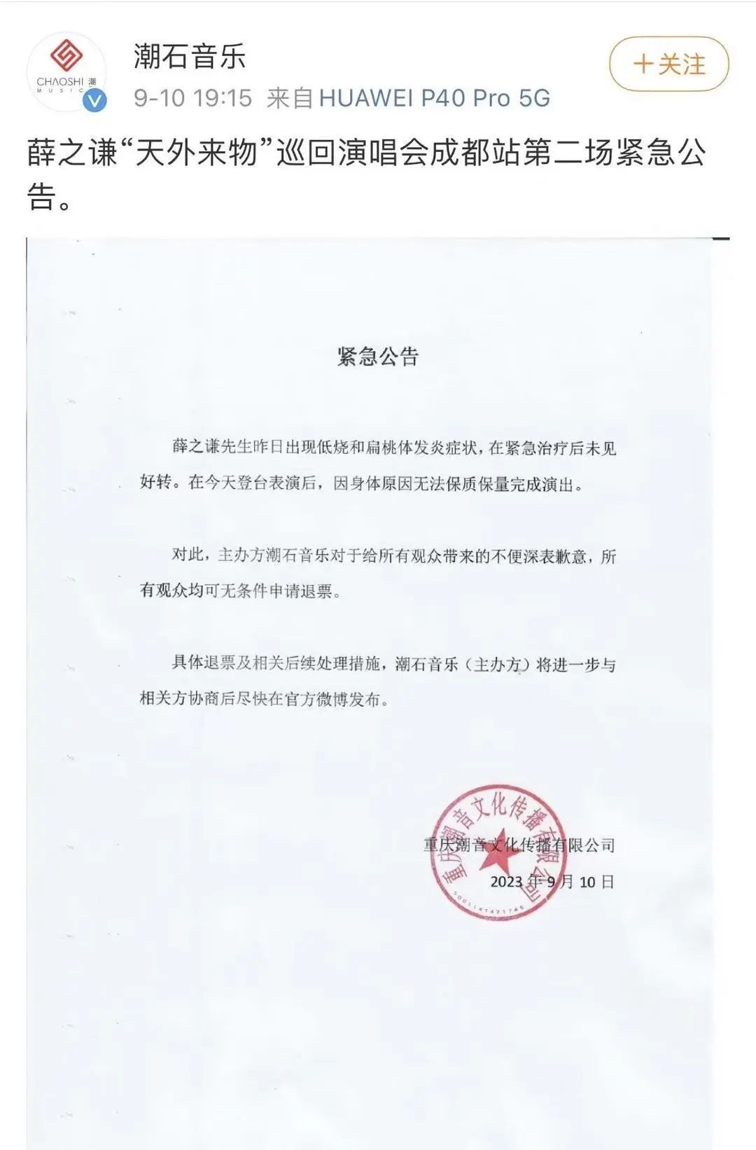 9月13日晚,周杰伦在更新动态时透露自己脚受伤了。他晒出了和余文乐打网球的照片,并配文:“等我脚好了,我可能又会赢到一支拍子。” 据悉,9月8日,周杰伦在天津开演唱会时被传有设备突发故障,导致周杰伦被困其中近20分钟,疑似腿部受伤。不过,随后其经纪公司否认了这一说法,表示所谓被困铁球一事子虚乌有,周杰伦身体也没有问题。 今年,明星扎堆开演唱会,国内演出市场持续火爆。但高强度的工作,也让他们的身体有些吃不消。 9月8日晚,五月天阿信演唱会吸氧冲上了热搜。 当晚五月天的歌迷上传了一段视频,在五月天西安演唱会的talking环节中,主唱阿信抱着蓝色枕头上场。阿信解释蓝色枕头里面是氧气,自己有点缺氧,正在吸氧。 而在9月10日晚,薛之谦“天外来物”巡回演唱会成都站第二场开启,但在开始后他表示自己烧到39度,演出无法进行。稍后,潮石音乐官微紧急发布公告,宣布演唱会暂停并安排退票。 为了不让歌迷失望,薛之谦虽身体不适但还是坚持在台上与歌迷交流,在表达歉意后他还承诺,除了安排退票外,坐动车、飞机并预订了酒店来看演唱会的外地观众,这些费用都可以退,他全部负责。 文章来源于红星新闻,如有侵权请联系删除。本文仅代表作者观点,不代表大湾网的观点立场。 |