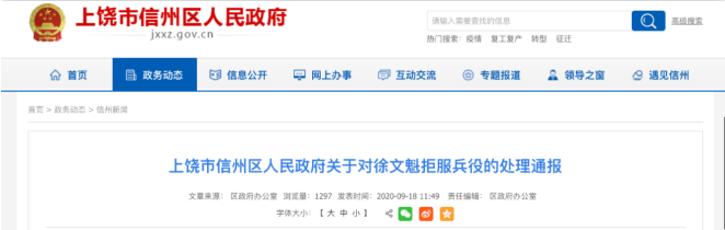 | 9月18日,江西省上饶市信州区人民政府网站发布《关于对徐文魁拒服兵役的处理通报》称,经信州区征兵工作领导小组研究,决定给予徐文魁作拒服兵役问题处理。 通报全文如下: 2020年夏秋季征兵期间,我区东市街道适龄自愿报名的应征青年徐文魁,男,身份证号3623011998*****018,大专应届毕业,经征兵体检、政考合格,被信州区征兵工作领导小组确定为2020年信州区预定新兵并参加役前训练。 役前训练期间,徐文魁思想反复波动,入伍意愿下降,经常以各种理由拒不参加训练和集体活动,经干部骨干多次教育引导,未有任何改变。 鉴于徐文魁此情况,依据《中华人民共和国兵役法》《江西省征兵工作条例》等法律法规,经信州区征兵工作领导小组研究,决定给予徐文魁作拒服兵役问题处理。处理意见如下: 一、由东市街道办事处对徐文魁进行不少于10天《国防法》《兵役法》等相关法律集中教育; 二、将徐文魁纳入履行国防义务失信名单,银行部门三年内不得给予徐文魁信贷优惠政策和利率优惠支持; 三、组织部、人社局和相关单位,两年内不得录用徐文魁为公务员或者参照公务员法管理的工作人员及国有企业工作人员; 四、公安部门在徐文魁个人户籍“服役栏”备注“拒服兵役”永久字样,两年内不得为其办理出国(境)相关手续; 五、教育部门两年内不得为徐文魁办理入学和升学手续; 六、市场监督管理部门三年内不得为徐文魁办理经商手续; 七、按照信州区2019年义务兵优待金的1—3倍予以罚款20000元,由东市街道办事处执行,罚款上缴区财政; 八、由新闻媒体将徐文魁行为及惩处结果作为违反《兵役法》的反面典型,向社会通报。 拒服兵役 看看《兵役法》怎么说?