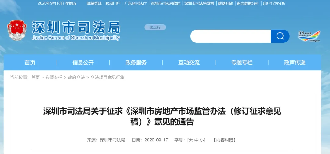 9月17日,深圳市司法局发布关于征求《深圳市房地产市场监管办法》(修订征求意见稿)意见的通告。