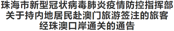 最新通告! 这类人经珠澳口岸通关 需要注意这些事项! 根据中央、省的工作部署,内地与澳门人员逐步恢复正常往来,9月23日起恢复办理广东省外的内地居民赴澳旅游签注。为落实常态化疫情防控措施和保障人员通关顺畅,结合珠澳口岸实际,经两地政府协商,现就持内地居民赴澳门旅游签注的旅客经珠澳口岸通关的相关事项通告如下: 一、人员范围 持公安机关出入境管理部门签发的内地居民赴澳门旅游签注的旅客。 二、通关口岸 (一)赴澳门的旅游团队旅客指定经港珠澳大桥珠海公路口岸或横琴口岸出入境。 (二)其他旅客可以选择港珠澳大桥珠海公路口岸、横琴口岸、拱北口岸、湾仔口岸出入境。 三、通关所需证明材料 (一)7天内有效核酸检测阴性结果证明。 (二)完成申领“粤康码”,凭“粤康码”绿码获取通关凭证。 (三)有效出入境证件。 四、注意事项 (一)配合口岸现场有关部门做好安全检查、健康申报、卫生检疫、核酸检测结果证明核查等疫情防控工作,随身携带内地号码手机并保持通讯畅通。 (二)配合口岸现场海关、边检部门办理出入境查验手续。 (三)当通关口岸出现拥堵等情况时,服从口岸现场截流、分流等安排。 (四)对未遵守本通告要求的旅客,将按疫情防控有关规定处理。 五、本通告自2020年9月23日零时起施行 珠海市新型冠状病毒肺炎 疫情防控指挥部 2020年9月22日 来源:珠海特区报 |