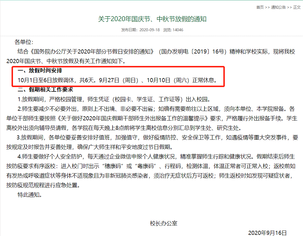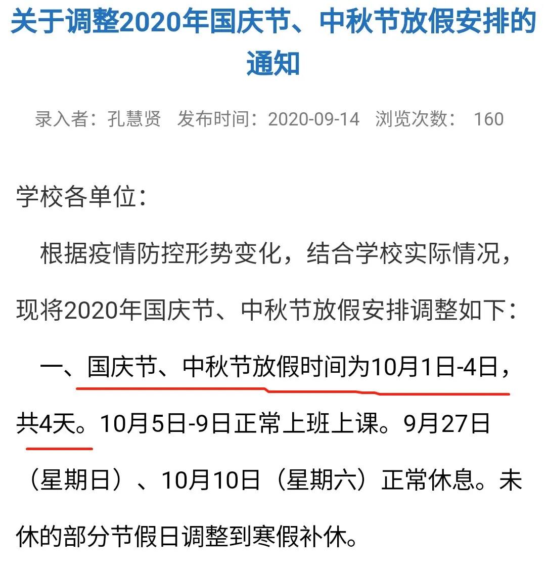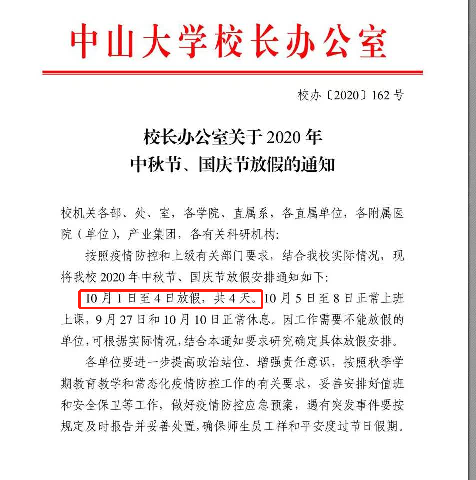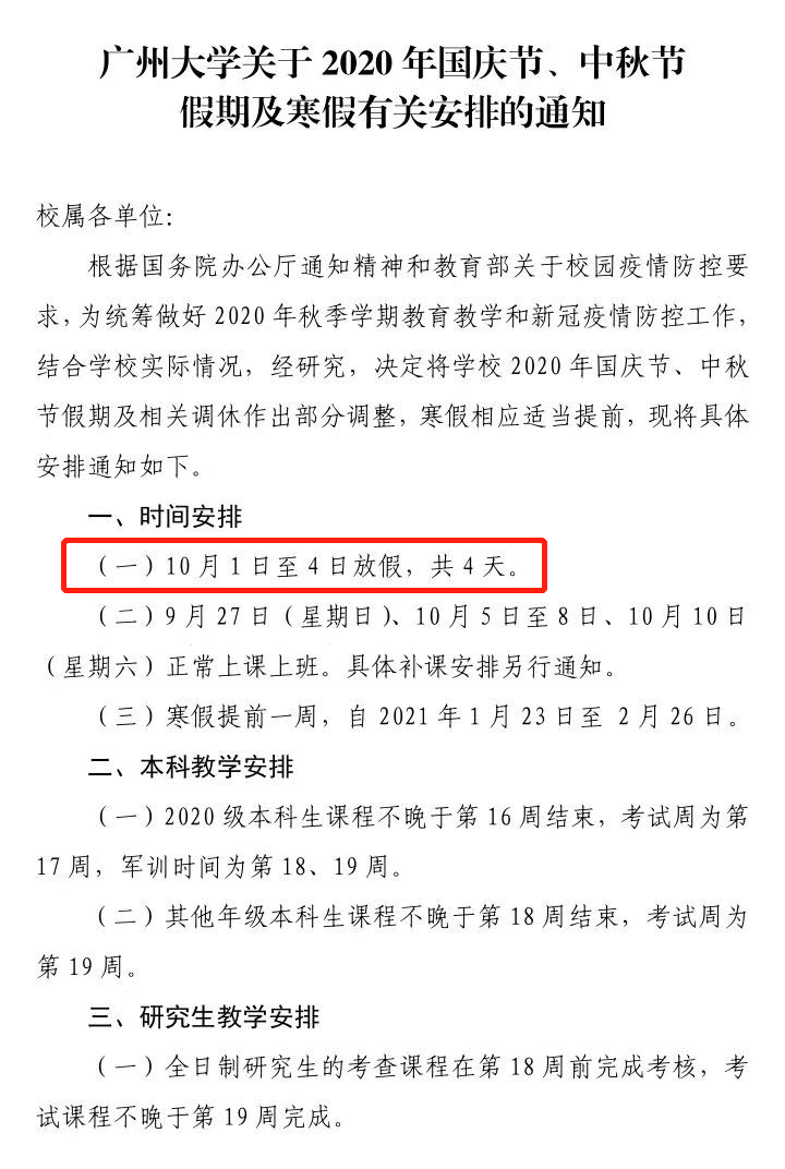 不过 不少广州高校发布调整 秋季教学时间安排的通知 对国庆假期进行了调整 部分高校缩短中秋国庆假期 ↓ ↓ 中大 10月1日至4日放假,共四天 9月17日,中山大学发布了《校长办公室关于2020年中秋节、国庆节放假的通知》。通知称,10月1日至4日放假,共4天。10月5日至8日正常上班上课,9月27日和10月10日正常休息。 华工 10月1日至3日放假,共三天 寒假提前 9月14日,华南理工大学党委办公室发布了《关于2020年国庆节中秋节放假及寒假有关安排的通知》。