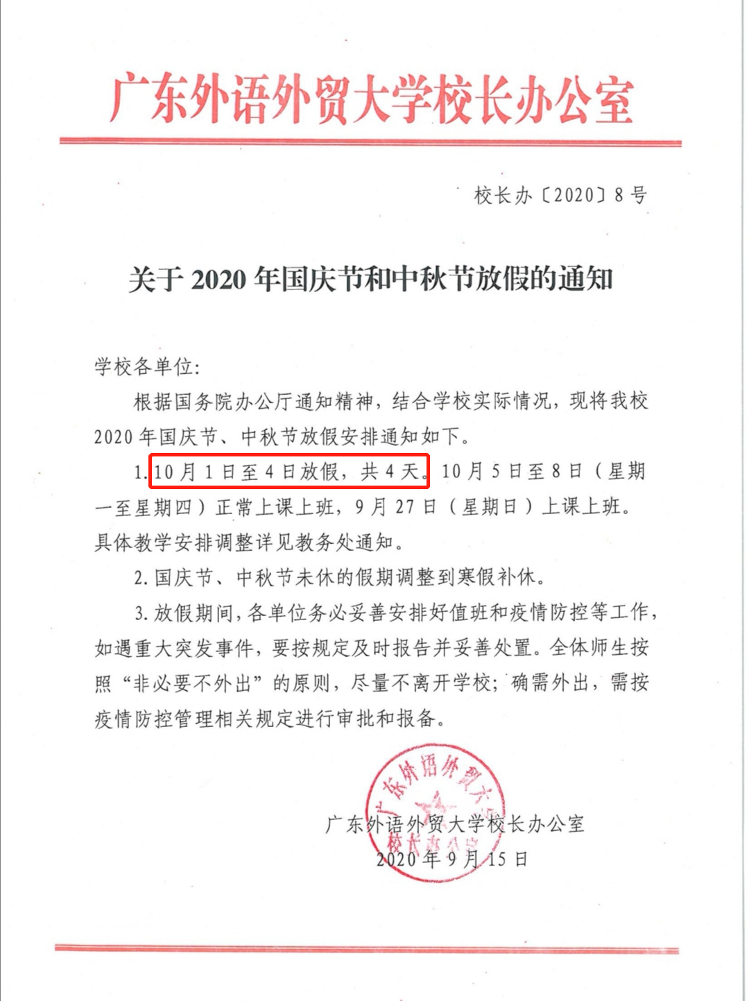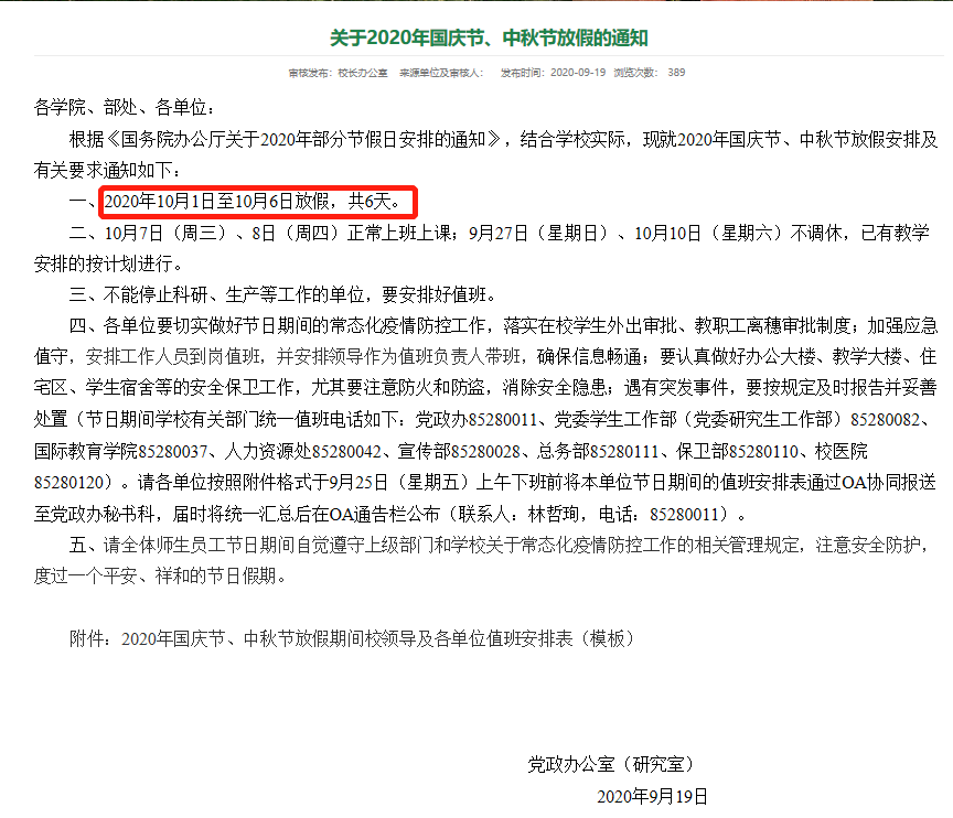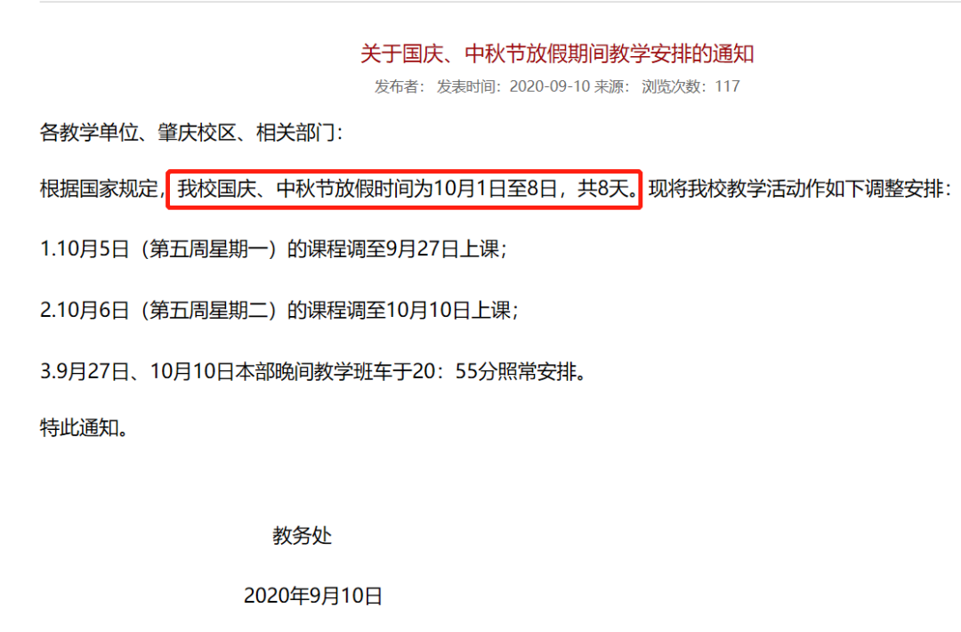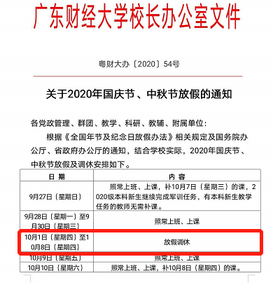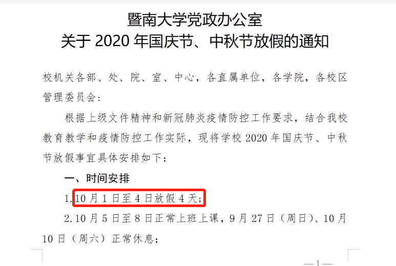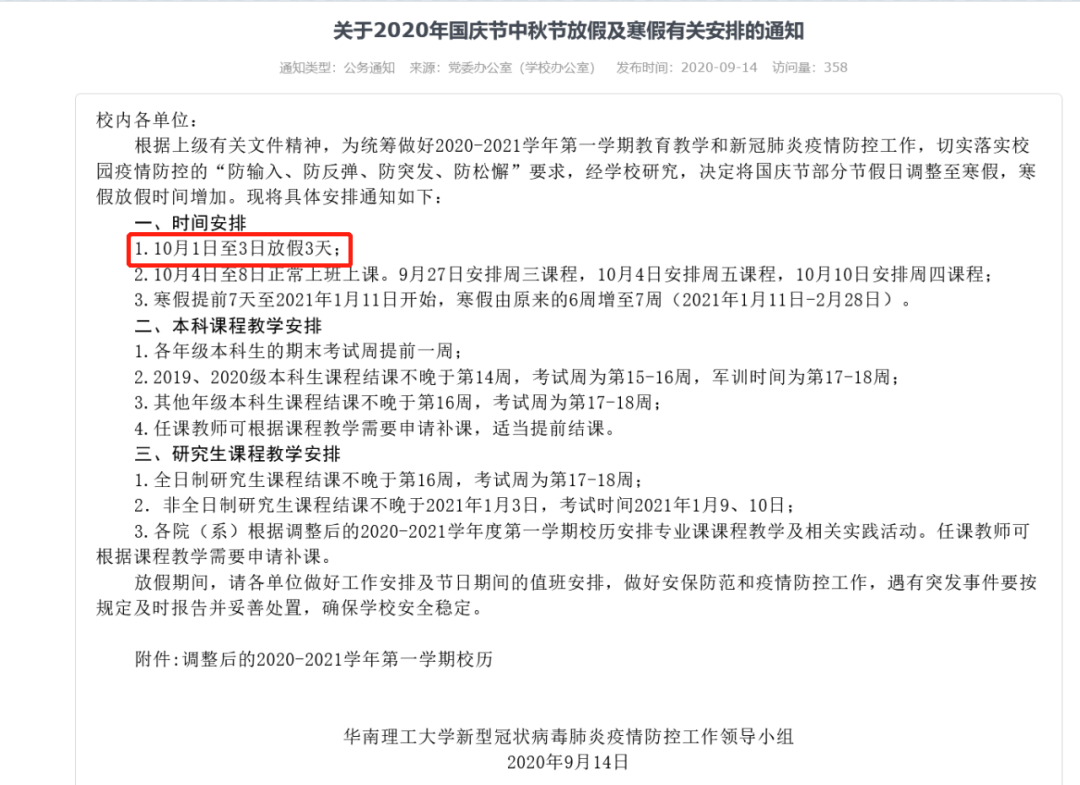 通知表示,经学校研究,决定将国庆节部分节假日调整至寒假,寒假放假时间增加。10月1日至3日放假3天,10月4日至8日正常上班上课。寒假则提前7天至2021年1月11日开始,寒假由原来的6周增至7周(2021年1月11日—2月28日)。